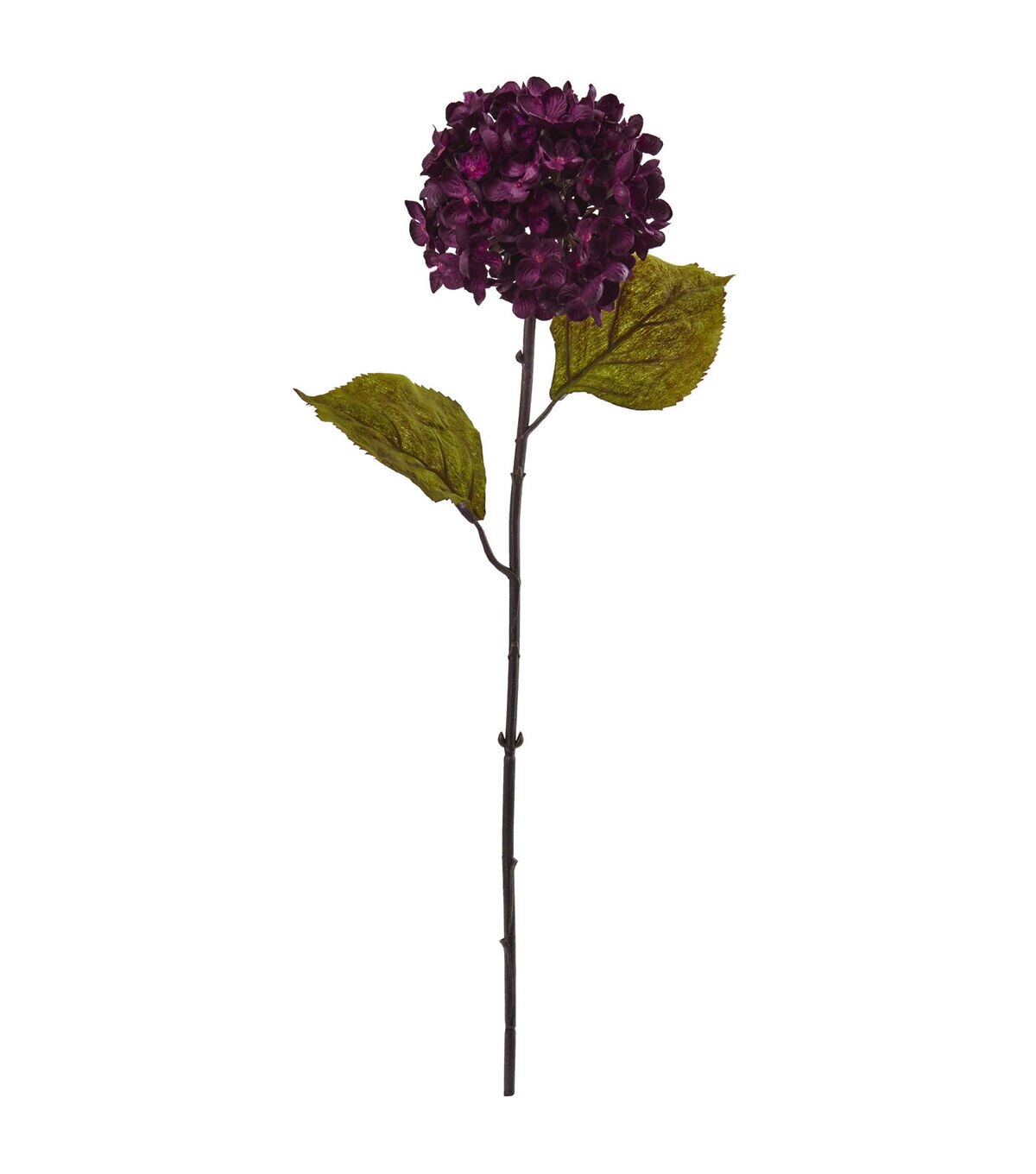 The fall hydrangea artificial flower spray is dramatic and lovely. Each 22-inch stem features a tight, round cluster of brilliant blooms at the top with a few realistic green leaves below. Cluster these together in a vase or add them to an existing autumn-themed faux floral arrangement in your entry way or living room. Arrives with a set of six individual flower stems.