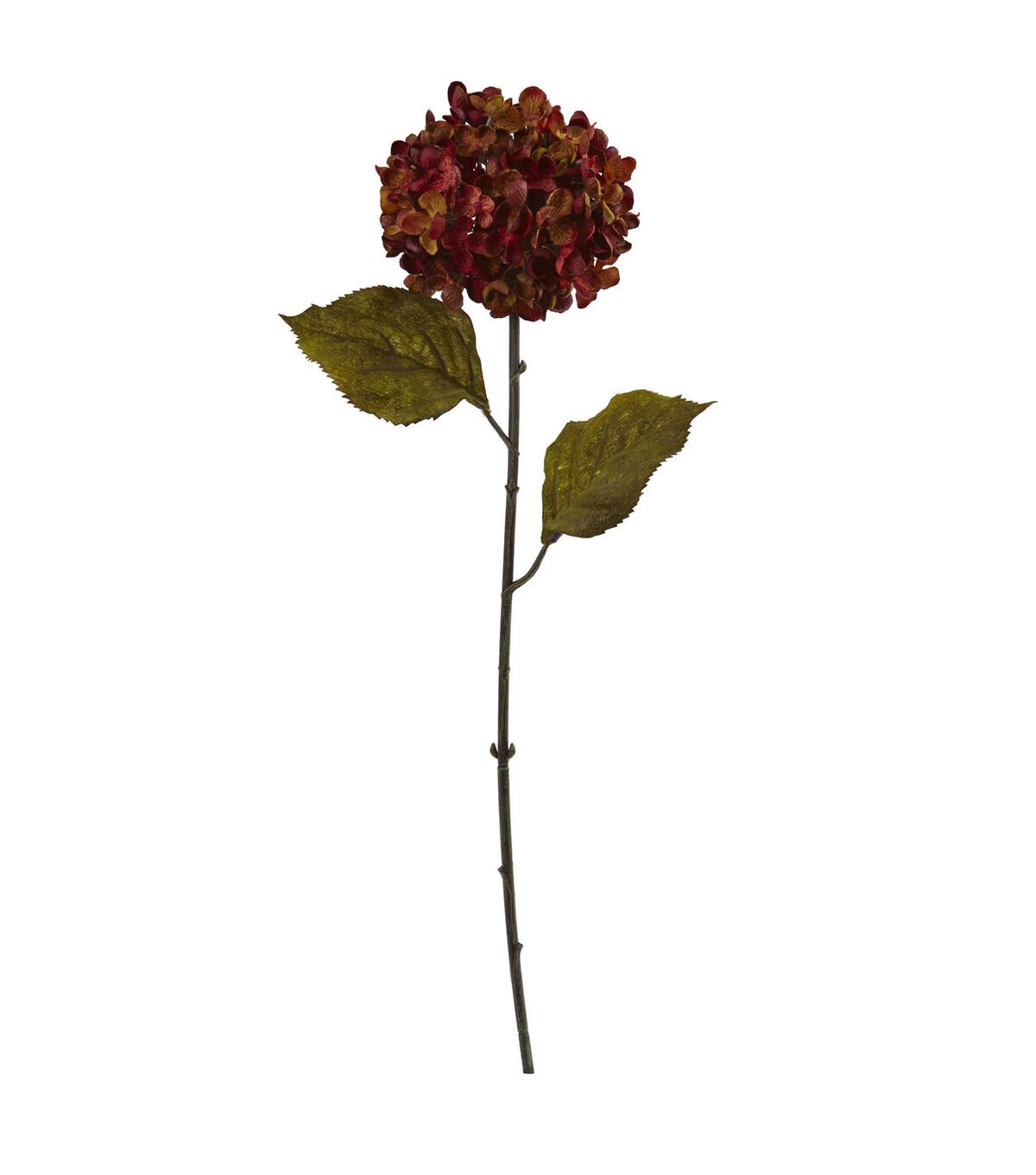 The fall hydrangea artificial flower spray is dramatic and lovely. Each 22-inch stem features a tight, round cluster of brilliant blooms at the top with a few realistic green leaves below. Cluster these together in a vase or add them to an existing autumn-themed faux floral arrangement in your entry way or living room. Arrives with a set of six individual flower stems.