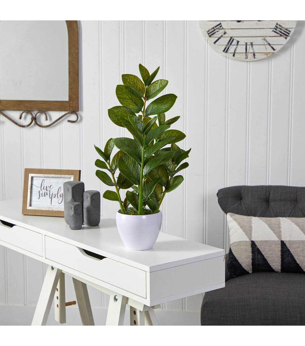 Social media’s trendiest plant is here for you to enjoy, maintenance-free. This lifelike artificial plant removes the guesswork, allowing you to enjoy its’ splendor without the upkeep. Thick, green leaves form feather-like foliage that brings depth and lines to spaces. Standing 22” from a white planter, this faux plant is the perfect accent for desktops and compact spaces. Recreate the African jungle look in your office, kitchen nook, bedside table, bathroom, or mantel.Silk plants are manufactured using synthetic materials, such as polyester material or plastic, and are well designed and constructed to be life-like in appearance. This item will need to be re-shaped when removed from the secure box to allow it to reach its fullest size. Your artificial plant will look beautiful for years to come; simply wipe clean with a soft dry cloth when needed. About Nearly Natural Inc. - For over 75 years, Nearly Natural Inc. has been providing conscientious consumers with beautiful alternatives to natural decorations. Employing and advised by naturalists who understand the live plant world, Nearly Natural is able to recreate the most realistic-looking decorative items for homes, offices, and businesses. Driven by a true commitment to customer service, attention to detail, and natural philosophy, Nearly Natural strives to bring customers the most beautiful, unique, and striking faux plants and floral on the market.