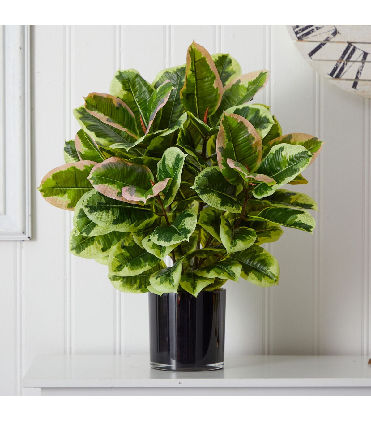 With beautiful, thick foliage, this faux rubber plant is as realistic as it is attractive. Made from the finest materials, it's also evergreen. The rubber plant has been set in a glossy black modern base, making it an appropriate complement to many styles of decor. Able to go almost anywhere, your living room, dining room, or bathroom would be a good home for it.