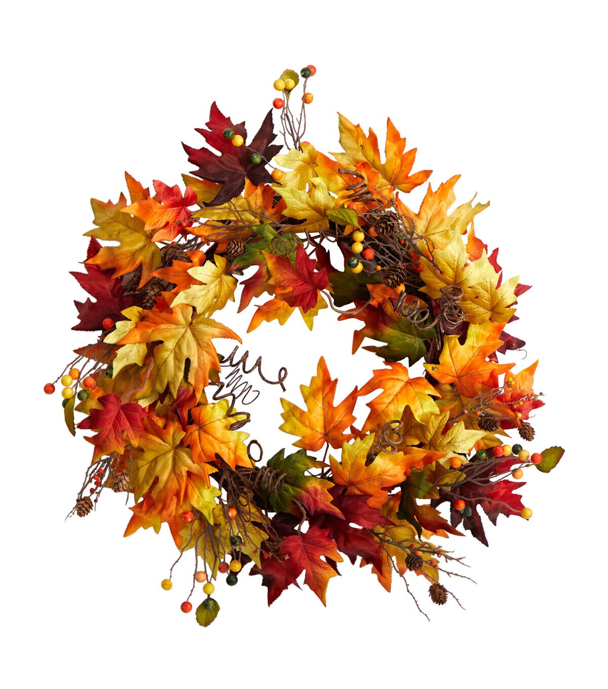 Feel like you're on a crisp autumn morning walk with this artificial wreath. Accented by berries, inject texture to any space in need of some festive color. A collage of fall foliage colors will set the scene during Thanksgiving. With a dimension of 24in., house this wreath in any bare wall or door. Crafted from high-quality materials, this wreath will last year after year. Artificial wreaths are manufactured using synthetic materials, such as polyester material or plastic, and are well designed and constructed to be life-like in appearance. This item will need to be re-shaped when removed from the secure box to allow it to reach its fullest size. Your wreath will look beautiful for years to come; simply wipe clean with a soft dry cloth when needed.