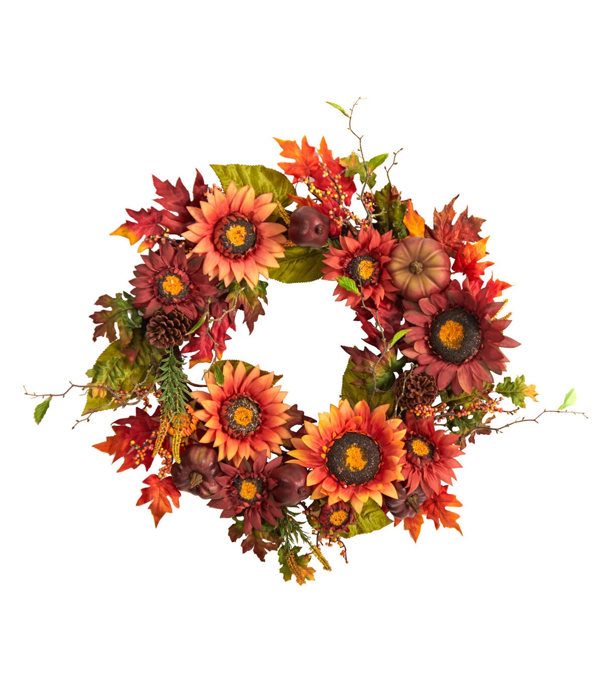 Capture the beauty of fall with this Autumn Sunflower, Pumpkin, Pinecone and Berries Artificial Wreath. Variegated sunflowers adorn a green silhouette of leaves, accented by a palette of fall-foliage inspired leaves. To soften the look and bring a rustic, intimate touch, pinecones add texture while the pumpkins bring an exciting draw to the eye and color. With dimensions of 24in., curate this wreath in a bare wall or door. Perfect for the Harvest season and Thanksgiving . Artificial wreaths are manufactured using synthetic materials, such as polyester material or plastic, and are well designed and constructed to be life-like in appearance. This item will need to be re-shaped when removed from the secure box to allow it to reach its fullest size. Your wreath will look beautiful for years to come; simply wipe clean with a soft dry cloth when needed.