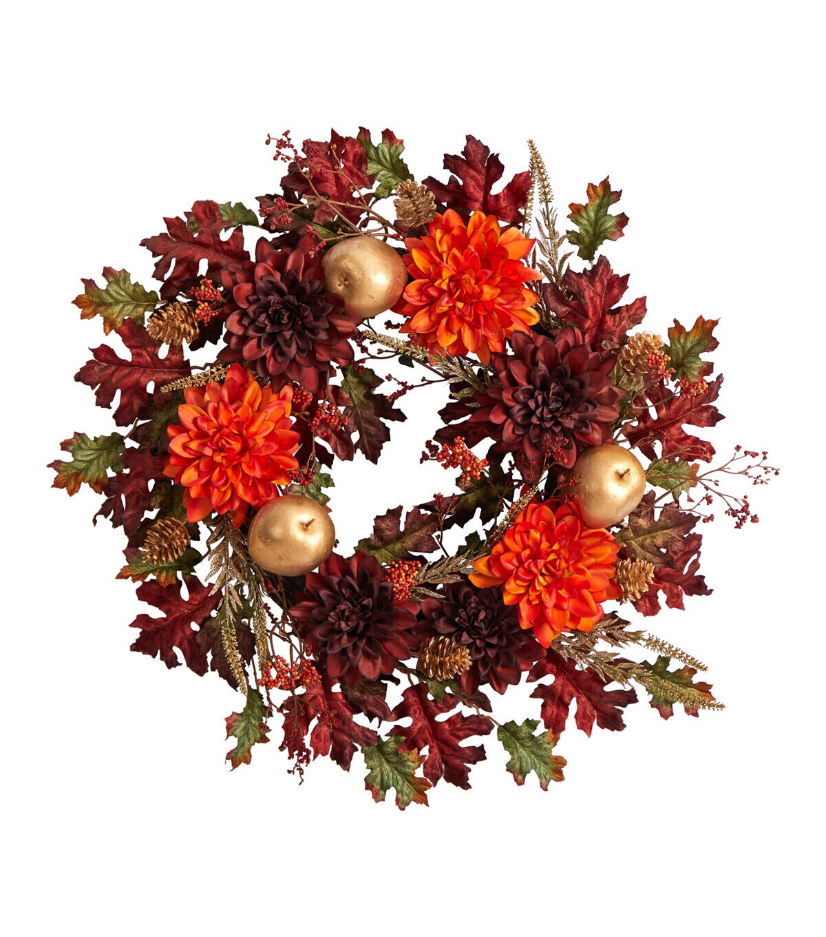 Savor the sweet ambience of apples and berries with this vibrant, multicolored artificial wreath. Shades of fall foliage-inspired hues envelop this gorgeous creation, surrounded by a blend of lush greenery. Each delicately crafted piece of fruit adds a natural element, synonyms with the harvest season. At 24in., it’s the perfect size to adorn your front door or display proudly on a dining room wall. Perfect for the Thanksgiving dinner. Artificial wreaths are manufactured using synthetic materials, such as polyester material or plastic, and are well designed and constructed to be life-like in appearance. This item will need to be re-shaped when removed from the secure box to allow it to reach its fullest size. Your wreath will look beautiful for years to come; simply wipe clean with a soft dry cloth when needed.