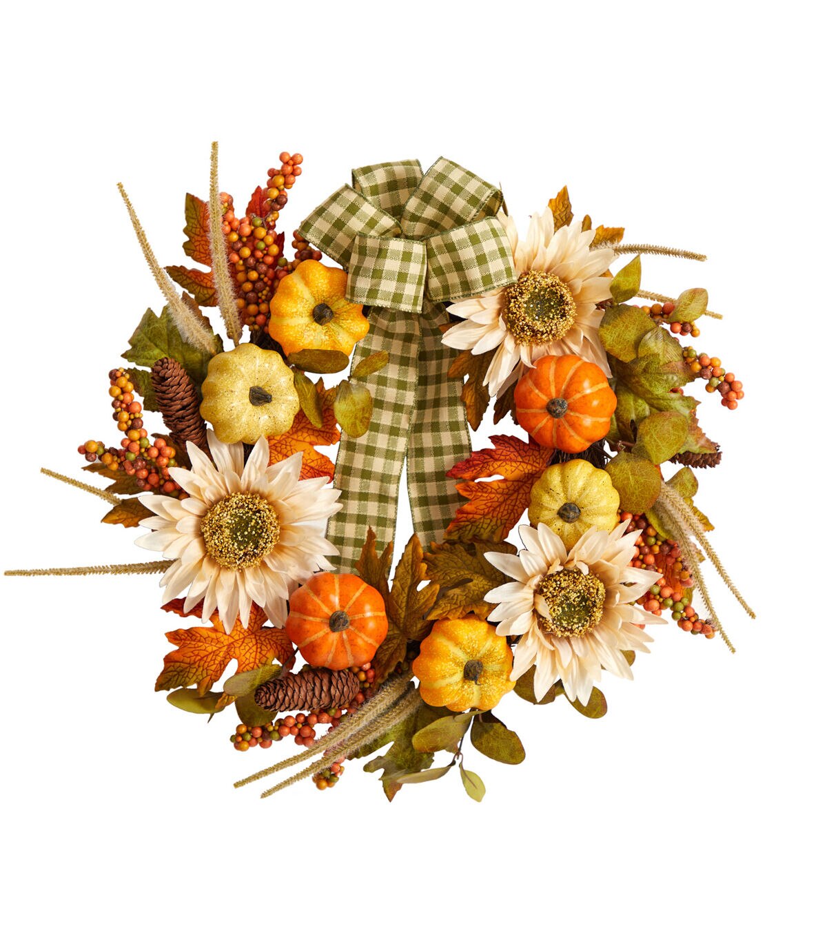 Looking for country chic vibes? Bring cozy, chic vibes to your space with this Fall Sunflower, Pumpkin Artificial Wreath. Sunflowers sit on a bed of maple leaves in a palette of fall foliage-inspired hues are accented by berries and pinecones for texture. Handcrafted from fine materials, we guarantee this artificial wreath will last many years. With a diameter of 24in. house in any bare wall or door. Can be used in a farmhouse inspired home or during Thanksgiving. Artificial wreaths are manufactured using synthetic materials, such as polyester material or plastic, and are well designed and constructed to be life-like in appearance. This item will need to be re-shaped when removed from the secure box to allow it to reach its fullest size. Your wreath will look beautiful for years to come; simply wipe clean with a soft dry cloth when needed.