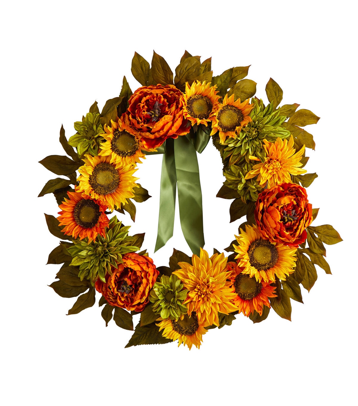 Welcome the striking colors of the season with this Peony, Dahlia, and Sunflower Artificial Wreath. Inspired by nature, vivid blooms mimic Mother Nature's beauty at every detail. Crafted from high-quality materials, these gorgeous flowers will brighten your space much longer than a fresh bouquet; feel free to display year after year. With a diameter of 24", hang in any area. Perfect for a bare wall or door. Silk wreaths are manufactured using synthetic materials, such as polyester material or plastic, and are well designed and constructed to be life-like in appearance. This item will need to be re-shaped when removed from the secure box to allow it to reach its fullest size. Your wreath will look beautiful for years to come; simply wipe clean with a soft dry cloth when needed.