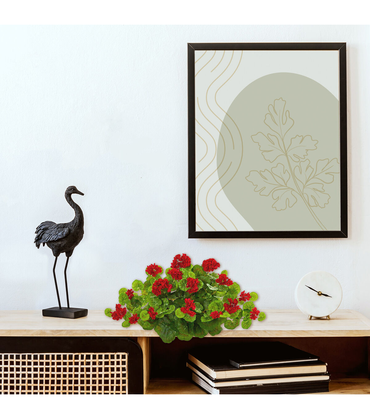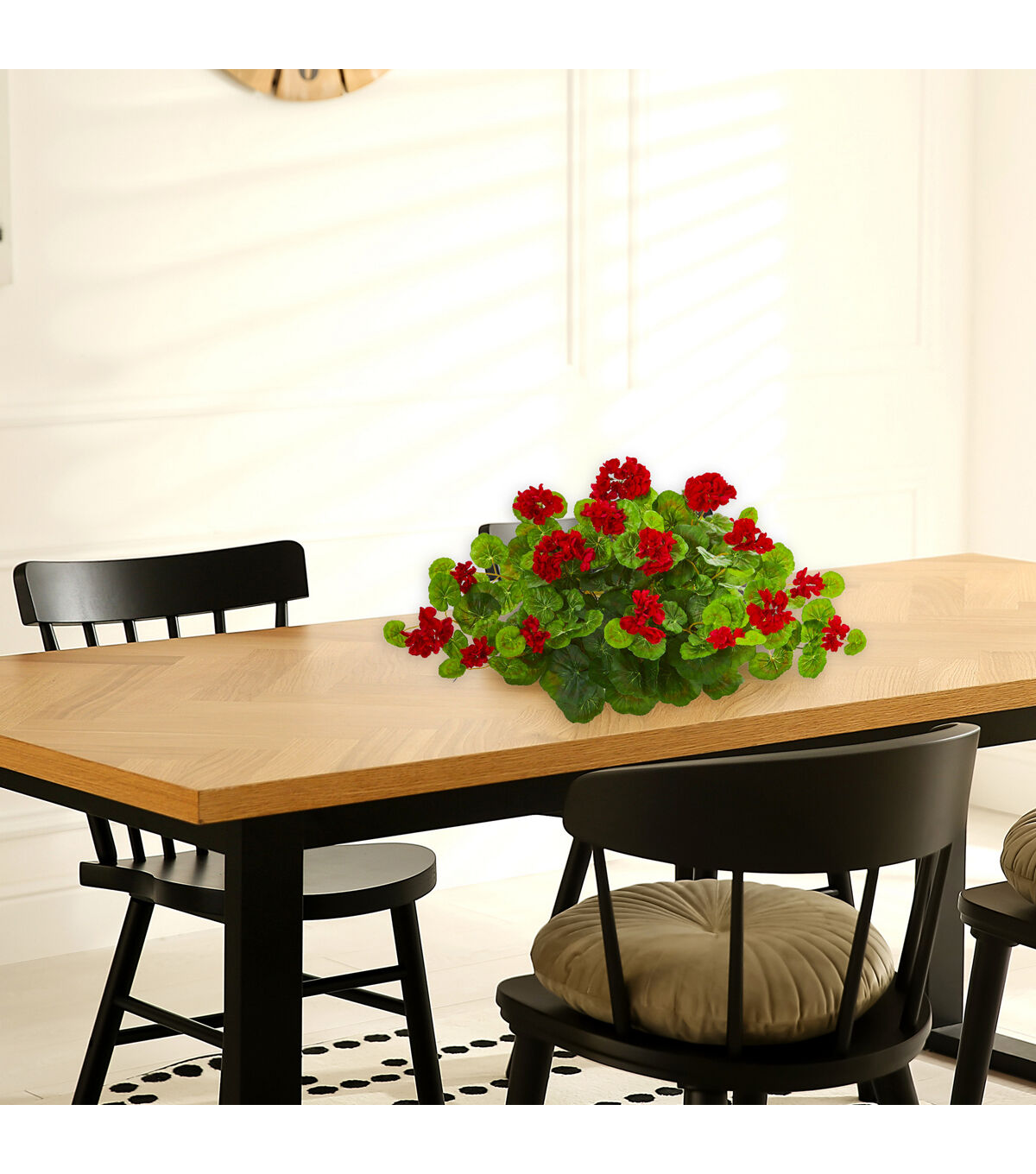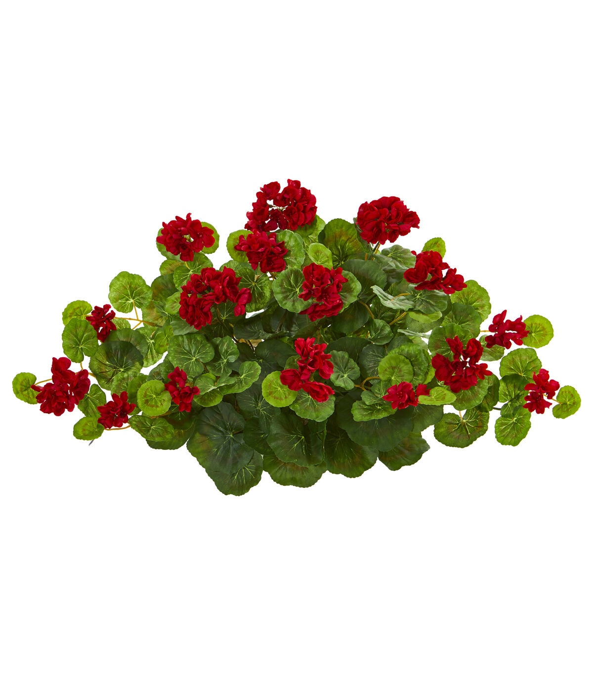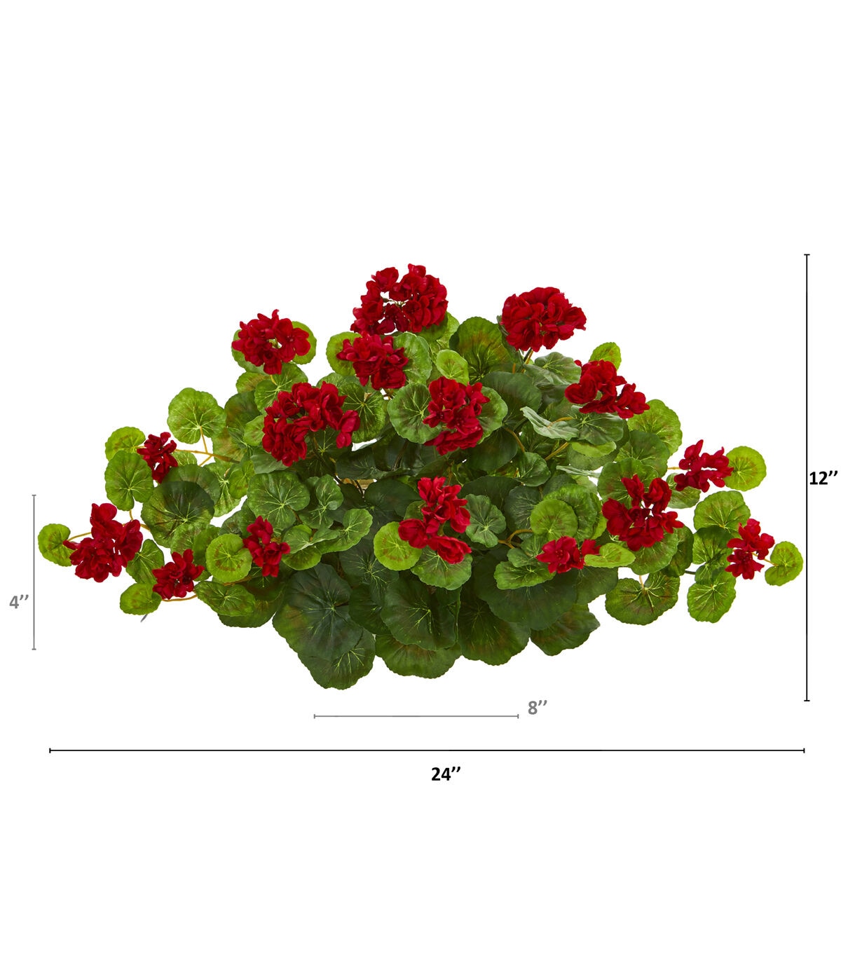 Incorporate a splash of bright color to your favorite spaces with this artificial geranium plant flaunting a rich collection of intricately designed silk flowers nestled amidst an overgrowth of vibrant green leaves. Set on decorative foam for easy placement, this 24in. long silk plant would easily enhance any environment it inhabits.