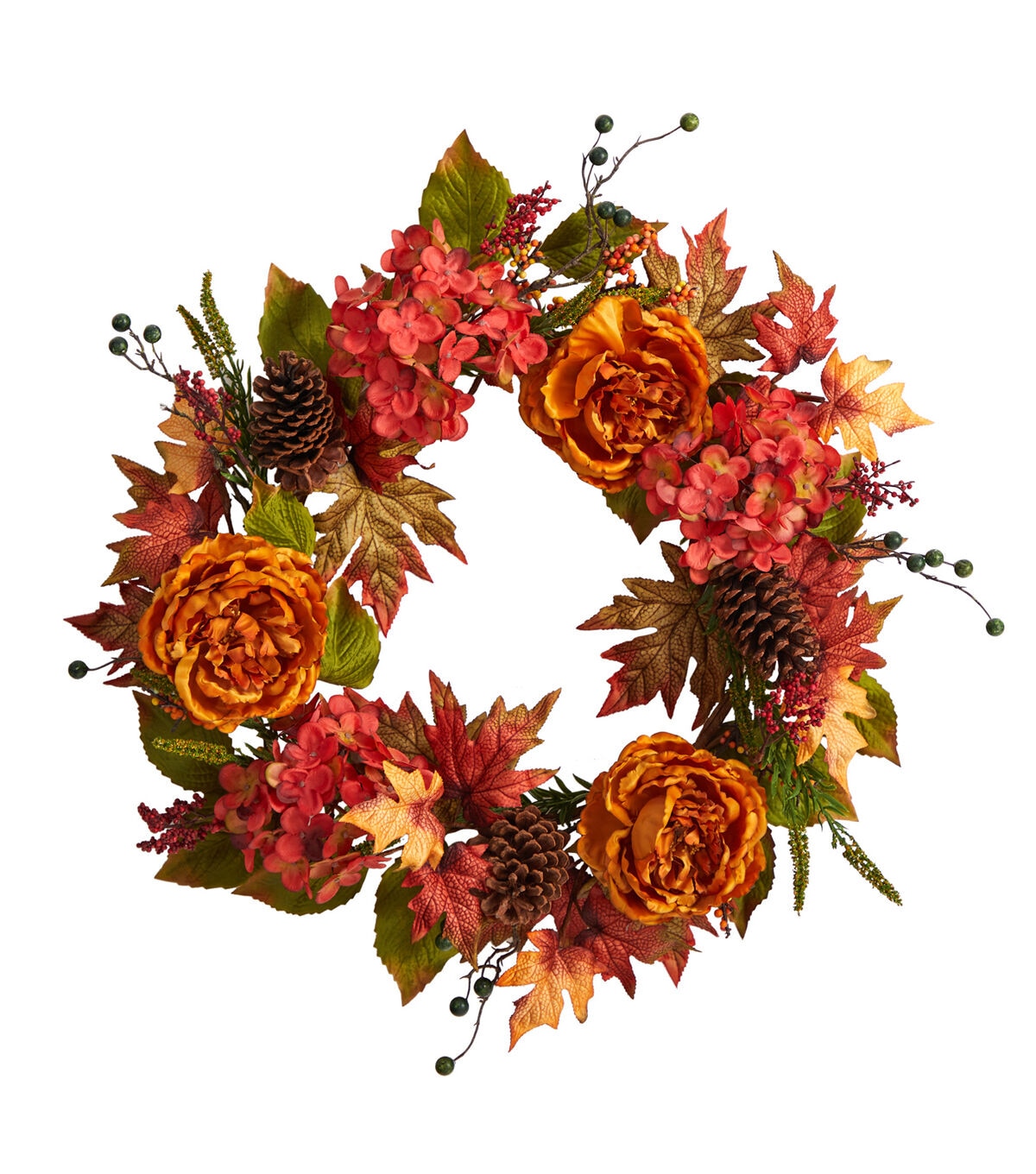 Capture the beauty of fall with this Hydrangea , Ranunculus and berries Artificial Wreath. Variegated hydrangeas adorn a green silhouette of leaves, all inspired by the fall foliage. To soften the look and bring a rustic, intimate touch, pinecones add texture while the berries bring an exciting draw to the eye and color. With dimensions of 25in., curate this wreath in a bare wall or door. Perfect for the Harvest season and Thanksgiving . Artificial wreaths are manufactured using synthetic materials, such as polyester material or plastic, and are well designed and constructed to be life-like in appearance. This item will need to be re-shaped when removed from the secure box to allow it to reach its fullest size. Your wreath will look beautiful for years to come; simply wipe clean with a soft dry cloth when needed.