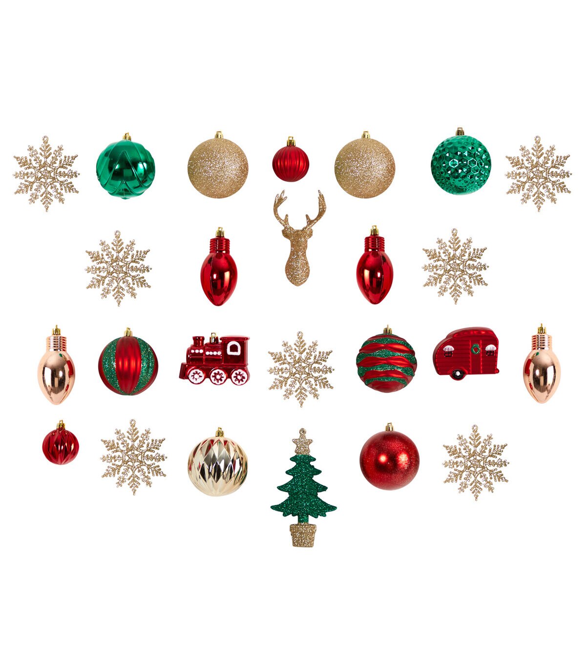 Feel nostalgic every holiday season with this set of 25 shatterproof Christmas tree ornaments. Our coordinated set of Christmas favorites, a Christmas tree, train, reindeer and decorations in a palette of Christmas-inspired colors complete any holiday décor scheme. The seasonal ornaments are shatterproof - eliminating the fear of damage. Arriving in a reusable tray for continual seasonal use, they’re perfect for mixing and matching. For a dazzling look, some of the ornaments come with glitter.