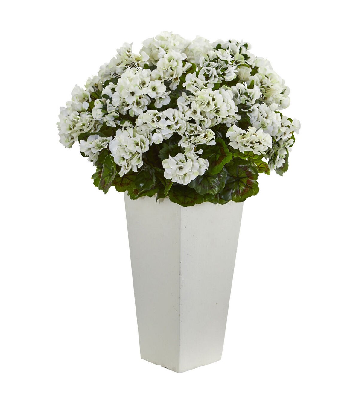 This brilliant artificial geranium is a perfect way to make a bold statement when placed on a conference table or end table. The faux blooms are so realistic that you'll almost think that you can smell them.
