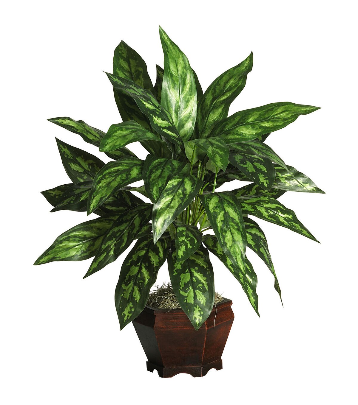 Create a regal environment in your home or office with this lovely silk Silver King. Slender stems adorned with glossy decoratively patterned leaves make this silk plant an ornamental delight. Nearly 2½ feet tall, this stately work of art makes a nice centerpiece or focal point for an otherwise drab office space. A cherry wood vase filled with moss adds a nice warm finishing touch.