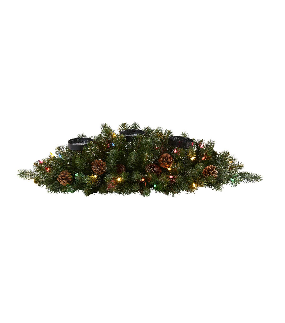 Set your home aglow this holiday season with the help of this artificial candelabrum; specifically designed as an elaborate candle holder, it’s intricately designed from a rich overgrowth of realistic looking evergreens, handsomely accented with miniature faux pinecones, carefully surrounding a trio of candle holders in a light frosting of fake snow. Better yet, this seasonal centerpiece comes already pre-strung with 35 multi-colored lights, eliminating pre-tangled messes and holiday stress. Reaching 30” long, this winter-ready decorative accent would make an enchanting addition to a mantle or a holiday-inspired tablescape. Silk arrangements are manufactured using synthetic materials, such as polyester material or plastic, and are well designed and constructed to be life-like in appearance. This item will need to be re-shaped when removed from the secure box to allow it to reach its fullest size. Your artificial arrangement will look beautiful for years to come; simply wipe clean with a soft dry cloth when needed.