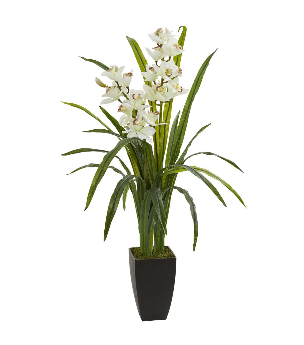 Pure white blooms rise above the two green stems and several long green leaves with this 39” cymbidium orchid artificial plant. With its elegant appearance, it'll look great when placed on your bedroom's nightstand, dresser, or vanity. Regardless of where you place this, be sure to surround it with LED candles to give your private quarters a more calm and relaxing ambiance.