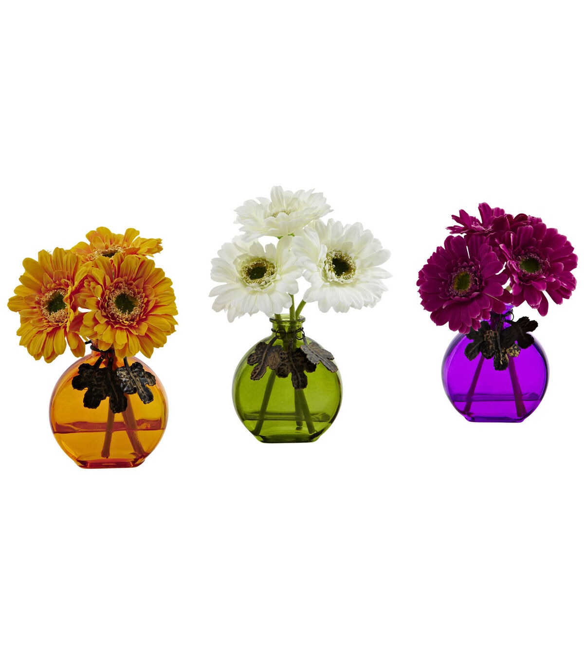 You will find three times the fun when it comes to this collection of cheerful Gerbera Daisies. Each bouquet comes housed inside a vibrant, colorful vase: Warm and inviting orange, lively and natural green, and majestic and exotic purple. The three flowers that make up each of the vase’s bouquets provide the perfect complement to their housing. Fun, and guaranteed to brighten any room, these selections are an automatic winner.