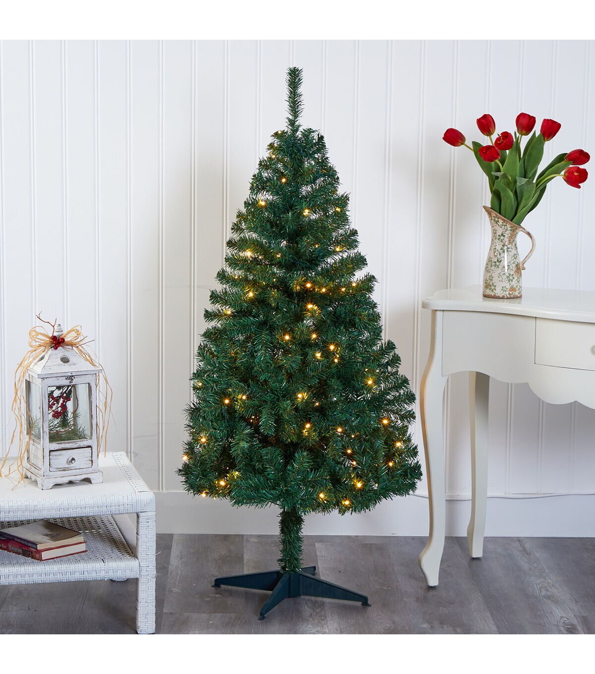 Light up your home or office this holiday by creating a traditional Christmas scene with the help of this easy and effortless Northern Tip Pine Artificial Christmas Tree. Completely maintenance-free, this realistic looking fake Christmas tree boasts a thick collection of evergreen foliage made up of 250 bendable branch tips, perfect for accenting with your own decorative ornaments. Arriving pre-strung with 100 clear LED lights to eliminate tangles and carefully stabilized on an accompanying stand, this versatile 4’ tall artificial Christmas tree will not only make decorating a breeze but ensure your home is always holiday-dressed for years to come. About Nearly Natural Inc. - For over 75 years, Nearly Natural Inc. has been providing conscientious consumers with beautiful alternatives to natural decorations. Employing and advised by naturalists who understand the live plant world, Nearly Natural is able to recreate the most realistic-looking decorative items for homes, offices, and businesses. Driven by a true commitment to customer service, attention to detail, and natural philosophy, Nearly Natural strives to bring customers the most beautiful, unique, and striking faux plants and floral on the market.