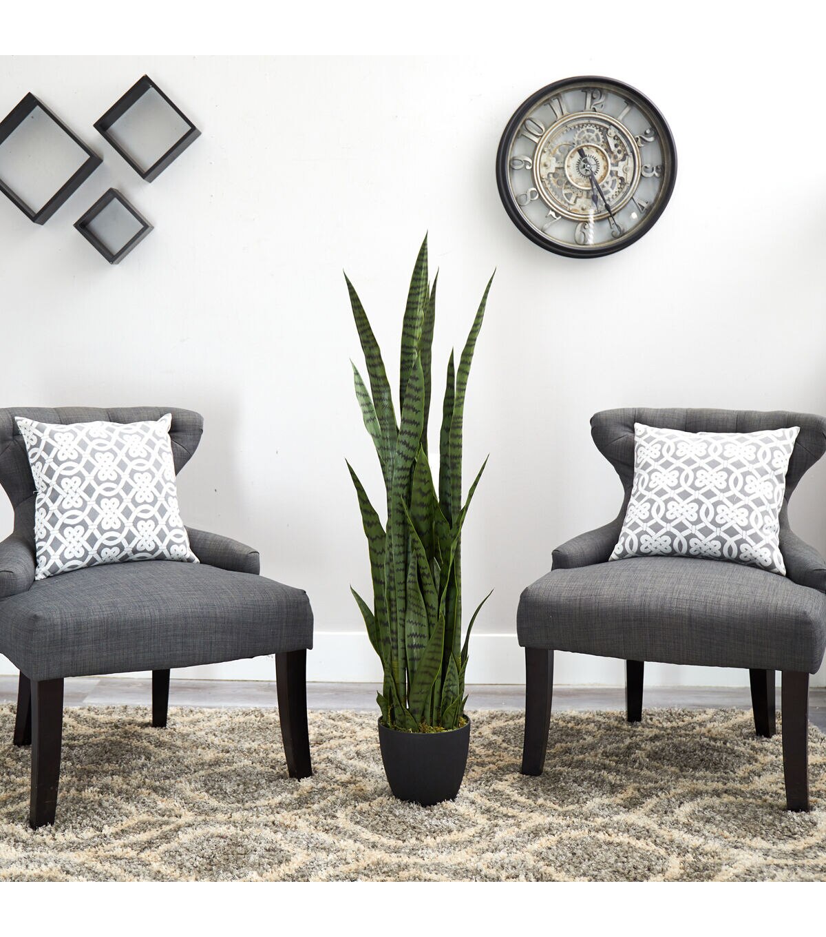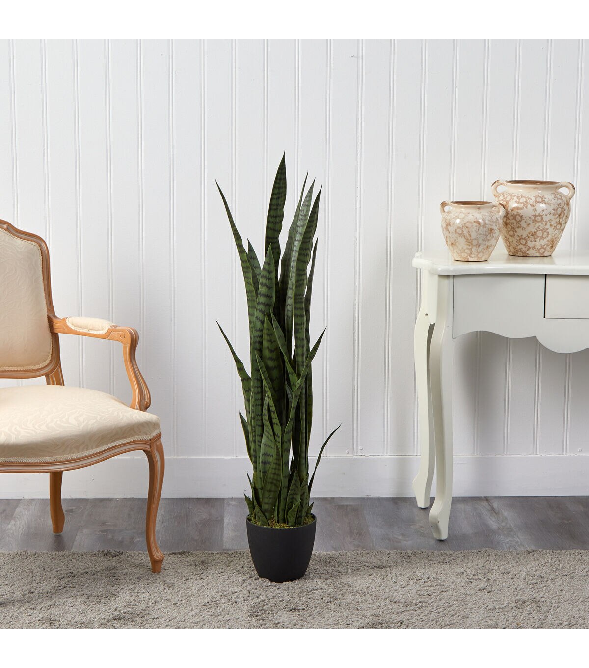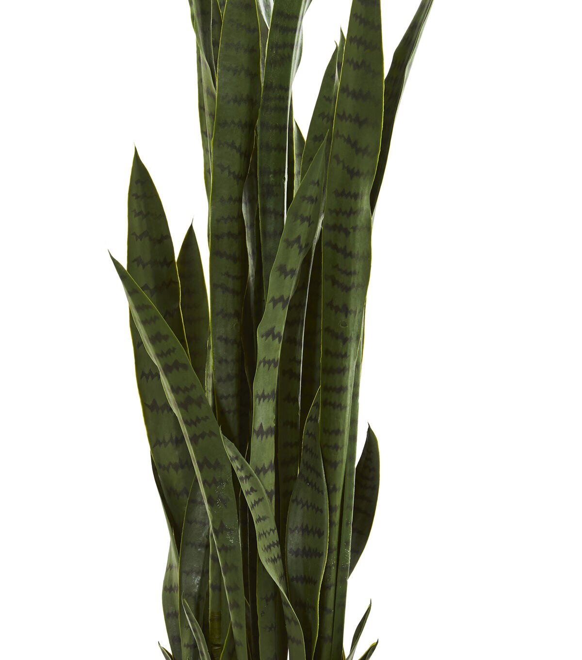 The 46 inch artificial sansevieria has long, straight-edged foliage that stands at various heights. The black stripes accenting each leaf amplify its realistic appearance. With its earth-toned coloring, it will make an excellent addition to any muted space like an office, study, or den. It will also look lovely on your sunroom's console table accented with a colorful doily underneath.