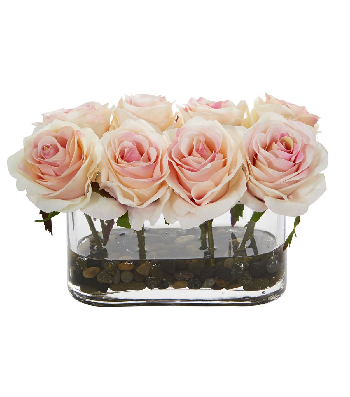 Giving off an aura of mystery and romance, these blooming roses are tinted with beautiful bright hues. They come in a glass vase with faux water and natural river rocks. These are the perfect addition to a sofa table or could serve as a centerpiece.