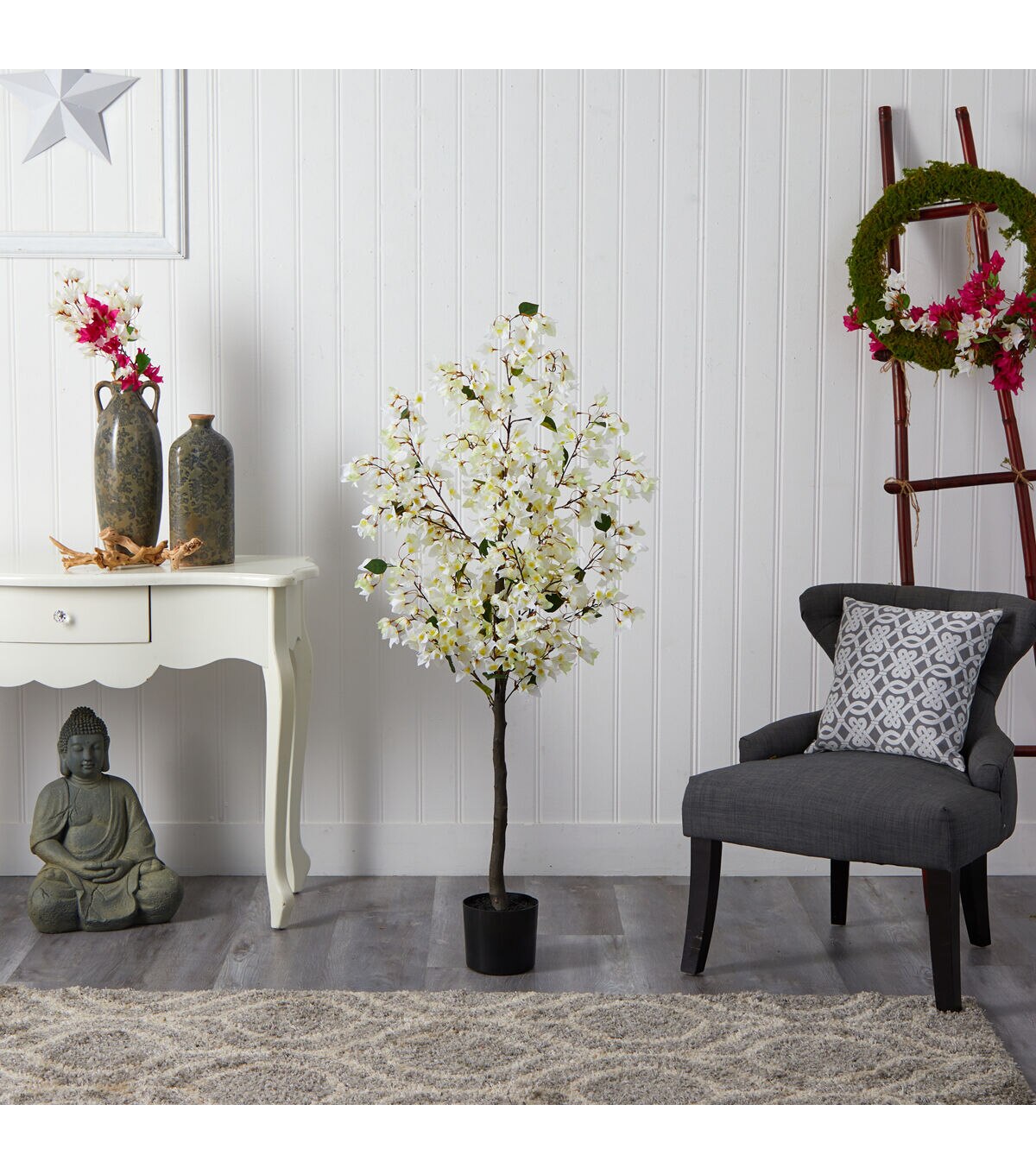 If you feel like showing your true colors, feel pretty in pink with this Bougainvillea artificial tree. A palette of vivid colored flowers stem from a realistic brown trunk. Inspired by nature, the lifelike flowers will brighten and refresh any corner. Standing at 5ft., from a nursery planter, bring a feminine touch with vibrant flowers. Designed and approved by horticulturists, display in any room that needs to bloom such as bathrooms, home offices or kitchens. Artificial trees are manufactured using synthetic materials, such as polyester material or plastic, and are well designed and constructed to be life-like in appearance. This item will need to be re-shaped when removed from the secure box to allow it to reach its fullest size. Your artificial tree will look beautiful for years to come; simply wipe clean with a soft dry cloth when needed.