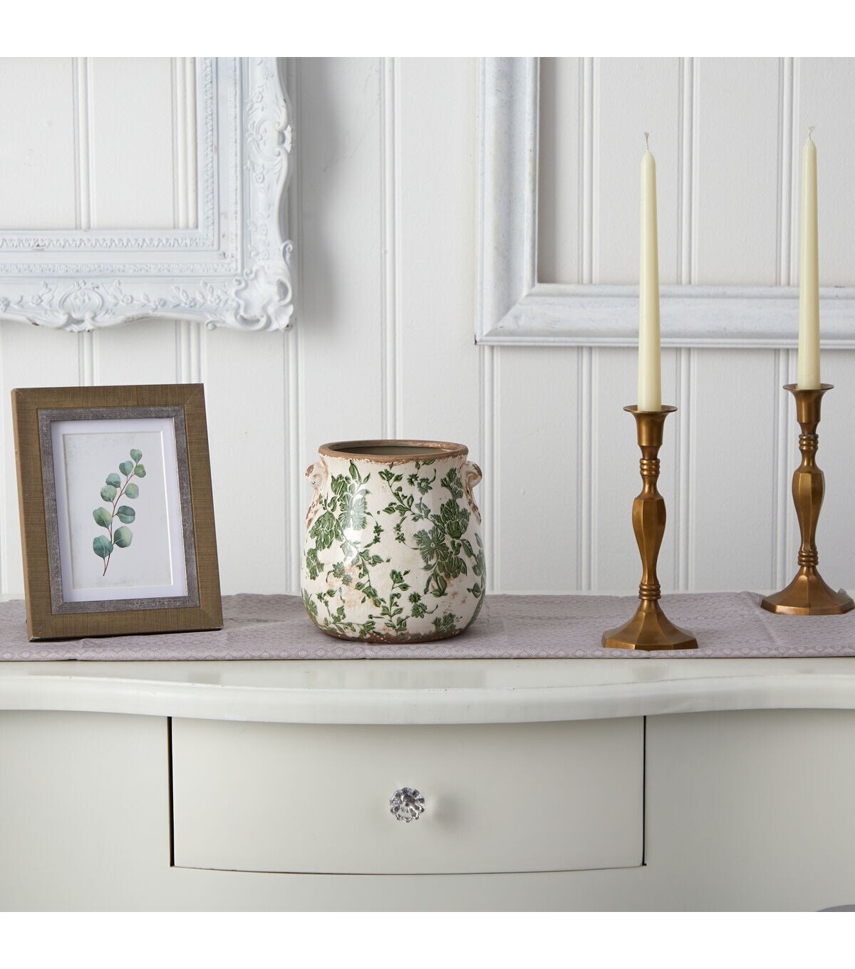 Arrange your faux-bulous flowers in this floral print vase (set of 1). The vintage ceramic planter has a homey feel with its palette of green flowers against a rugged backdrop. DIY and have fun mix-matching for a country chic look that delivers that fresh farm to home style. No drainage holes and indoor use only. About Nearly Natural Inc. - For over 75 years, Nearly Natural Inc. has been providing conscientious consumers with beautiful alternatives to natural decorations. Employing and advised by naturalists who understand the live plant world, Nearly Natural is able to recreate the most realistic-looking decorative items for homes, offices, and businesses. Driven by a true commitment to customer service, attention to detail, and natural philosophy, Nearly Natural strives to bring customers the most beautiful, unique, and striking faux plants and floral on the market.