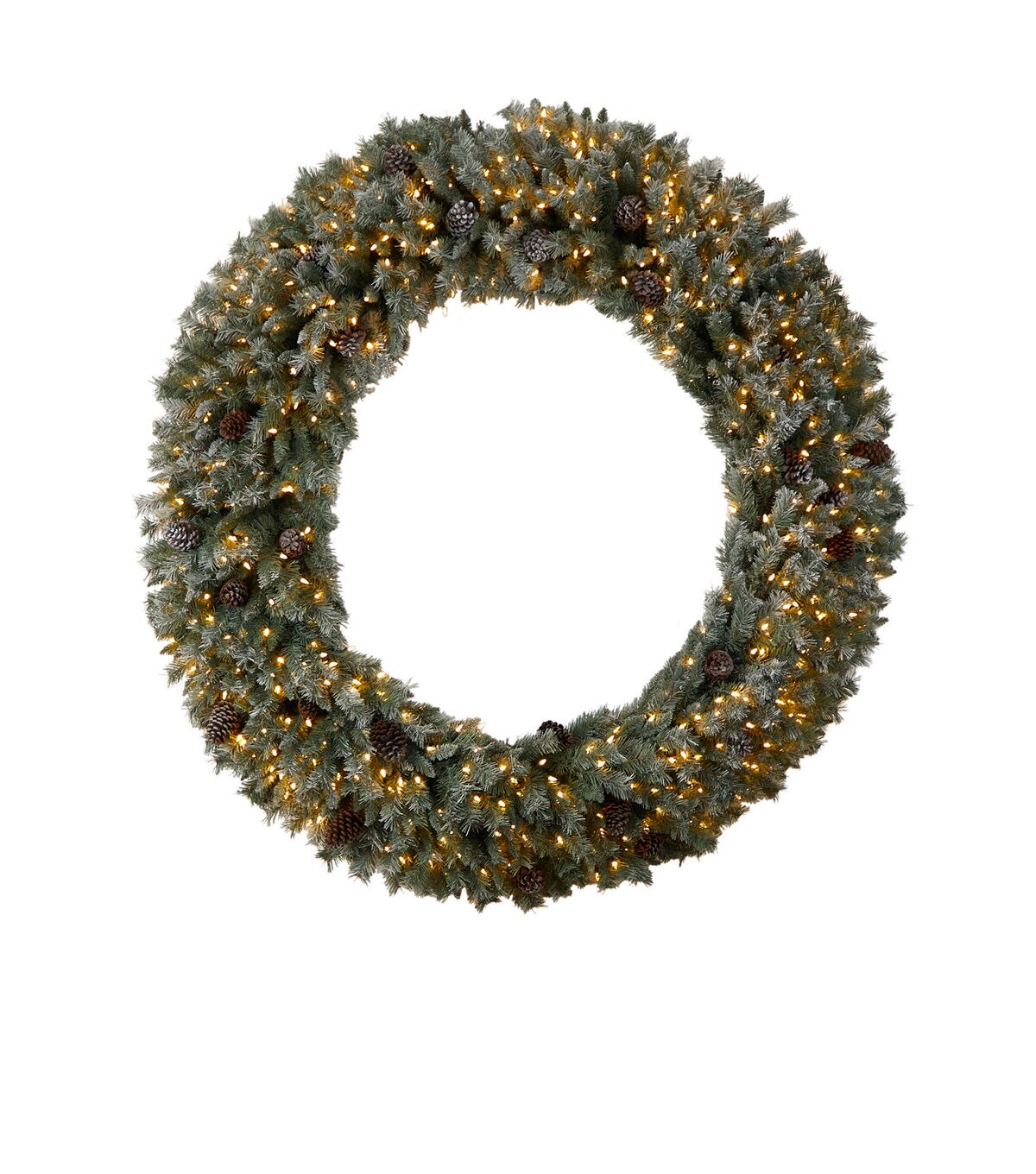 Add the WOW factor to your holiday décor with this flocked artificial Christmas wreath intricately designed from realistic looking pine foliage in a palette of seasonal evergreens flocked in a coat of faux-snow, carefully accented throughout with faux pinecones that look incredibly realistic. Arriving pre-strung with 600 clear LED lights to effortlessly illuminate either a large wall or door, this 6ft. (in diameter) decorative wreath makes for an inviting accent and will undoubtedly transform any entrance all throughout the holiday season. Perfect for a large space in need of some holiday cheer. Artificial wreaths are manufactured using synthetic materials, such as polyester material or plastic, and are well designed and constructed to be life-like in appearance. This item will need to be re-shaped when removed from the secure box to allow it to reach its fullest size. Your wreath will look beautiful for years to come; simply wipe clean with a soft dry cloth when needed.