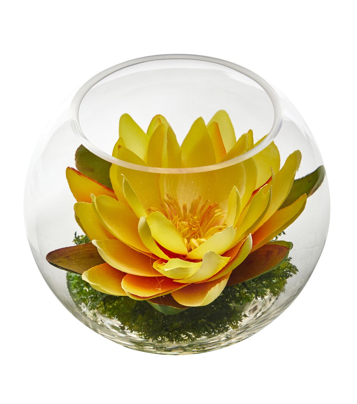 In many cultures, the Lotus represents spring, purity and rebirth. Known as the flower of life, bring the most scared flower into your living areas with this Artificial Lotus arrangement. A variegated Lotus flower in bloom will inject color into your living areas that soften, yet create a focal point with the vivid hues. Gracefully sitting on some moss elegantly add some grace into spaces. Enclosed in a glass vase with a width of 8" nestled with faux moss (included in height) curate in spaces that need a rebirth. Perfect for offices, bedrooms, kitchens and mantels. Silk arrangements are manufactured using synthetic materials, such as polyester material or plastic, and are well designed and constructed to be life-like in appearance. This item will need to be re-shaped when removed from the secure box to allow it to reach its fullest size. Your arrangement will look beautiful for years to come; simply wipe clean with a soft dry cloth when needed.
