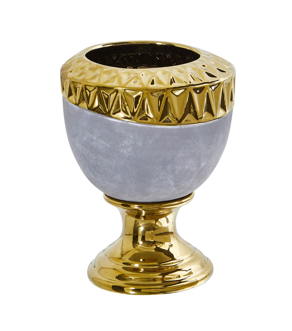 Love your new plant but not the planter? It’s your lucky day with this Stoneware Oval Vase with gold trimmings (Set of 1). DIY your own faux-bulous arrangement easily, effortlessly and confidently by adding your own finishing touches. If you’re into Hollywood glam or mid-century modern, you’ll love this ceramic vase’s gold trimmings against the stoneware base. Standing 9.25" high, you can set in a tabletop against a walled mirror for a chic look. No drainage holes.