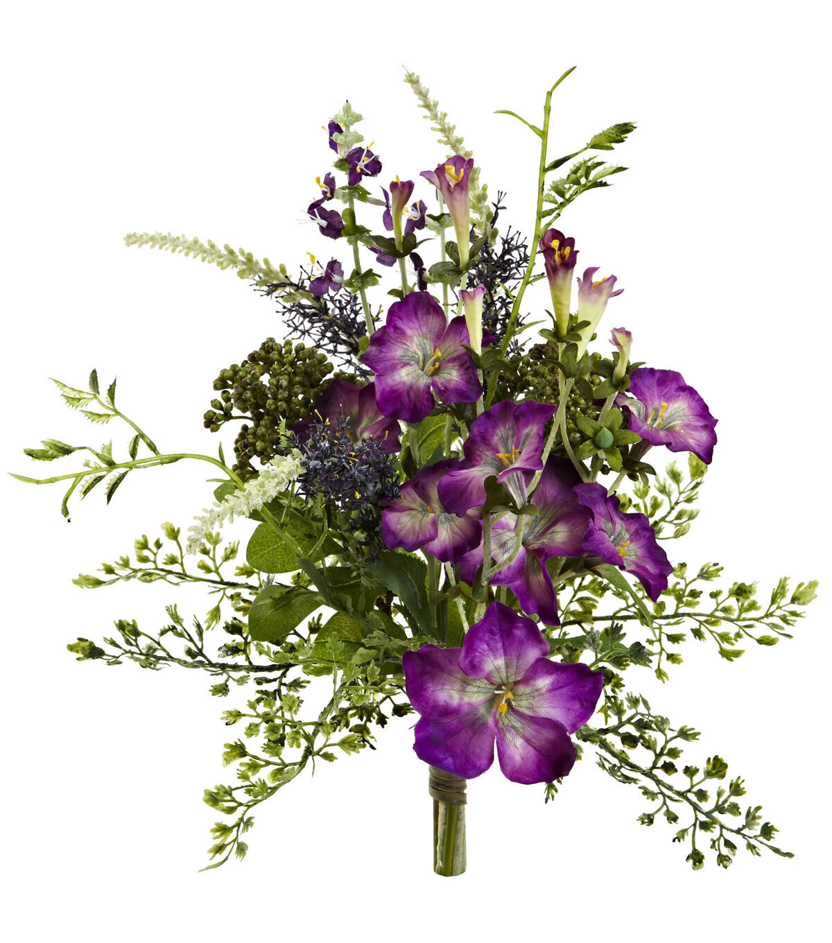 This artificial morning glory will be something that will start your day off right. The richly-hued variegated purple flowers in various sizes seem to be growing from the lifelike stem. The various buds and greens that surround the blossoms add extra dimension and life. A bright, happy arrangement, one of these can be placed in a small ceramic pot on an end table to brighten a room, or they can be clustered together in a vase in the bathroom for a more lush look.
