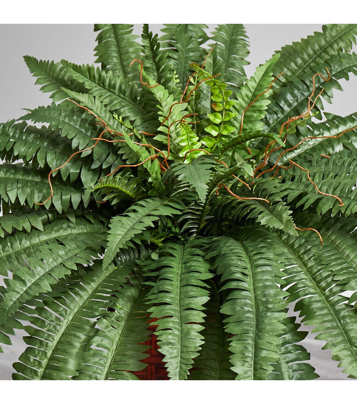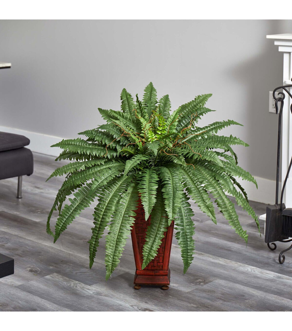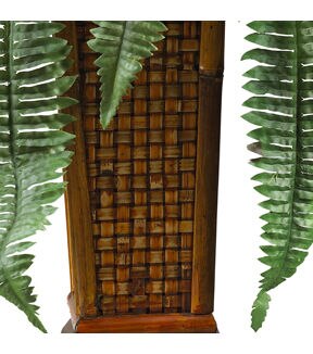 An abundance of lavishly designed fronds cover the spines of this exotic Boston fern. Dream of a vacation in the tropics as you gaze at this beautifully tailored creation. Bright green leaves sprouting forth inspire a look that’s both eclectic yet attractive. A full 33 inches tall, this plant will make a bold statement in your office or home décor. A stylish wood vase adds a touch of Asian appeal to this highly popular fern.