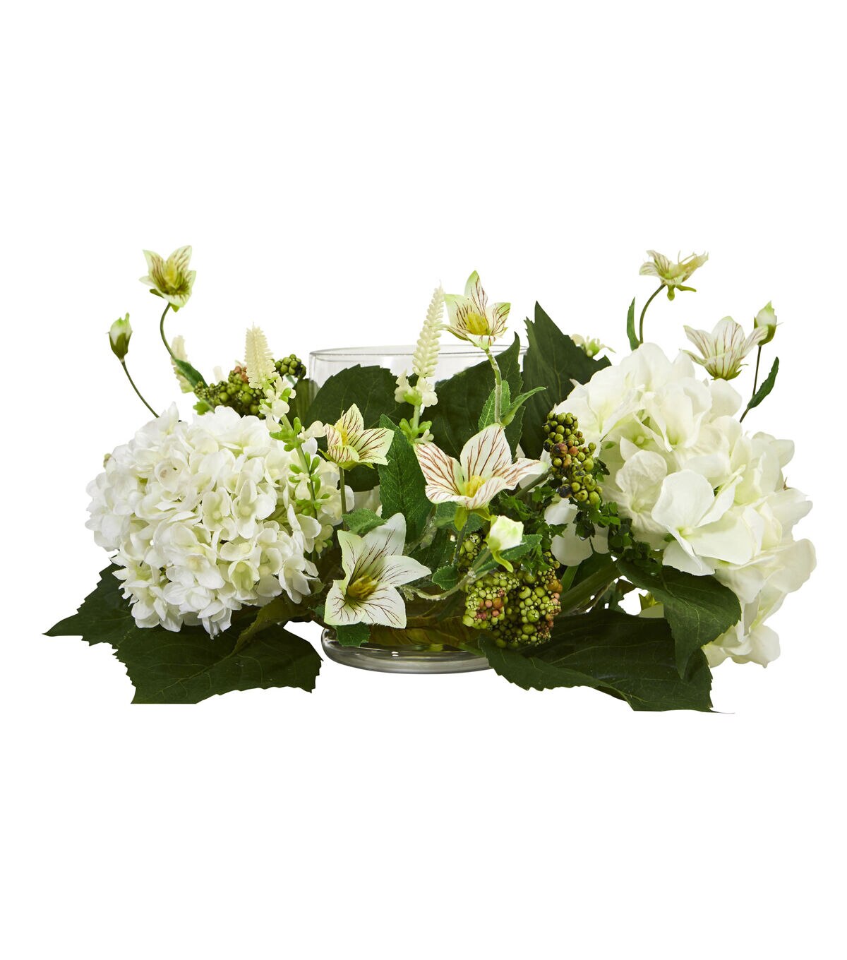It's hard to know where to start looking with this artificial hydrangea candelabrum! The large white flowers look soft to the touch, surrounded by other small blooms and rich leaves. No need to have additional decor on your dresser or table to complement this piece; it makes a statement all on its own. Silk floral arrangements are manufactured using synthetic materials and are well designed and constructed to be life-like in appearance.