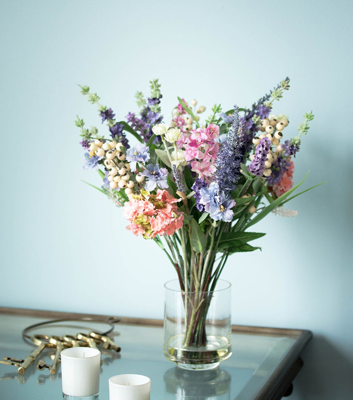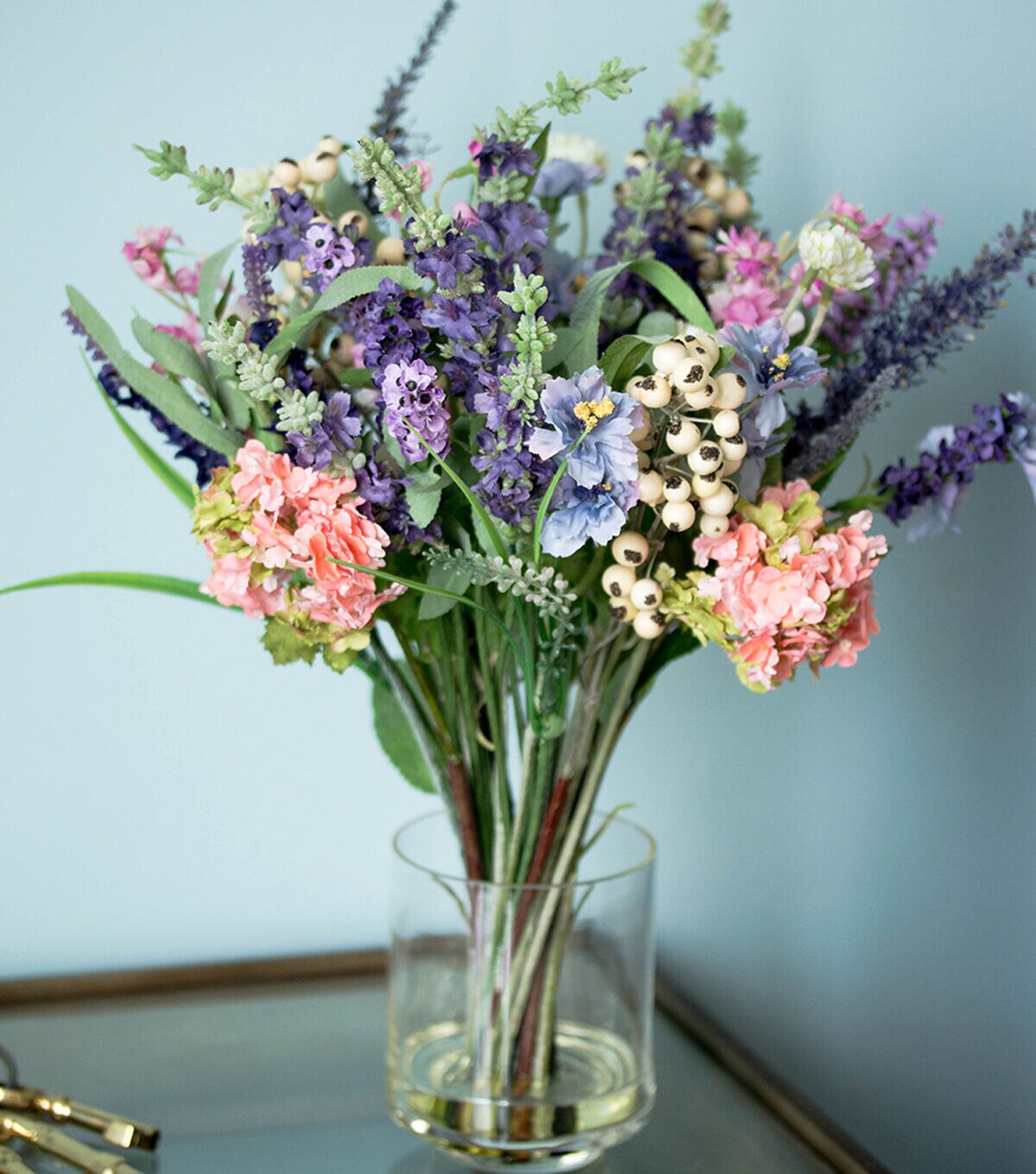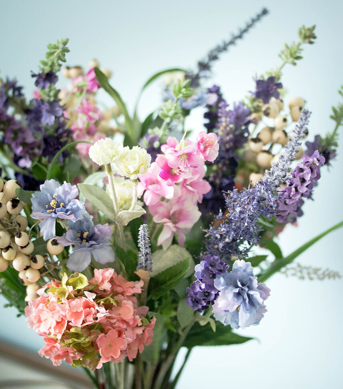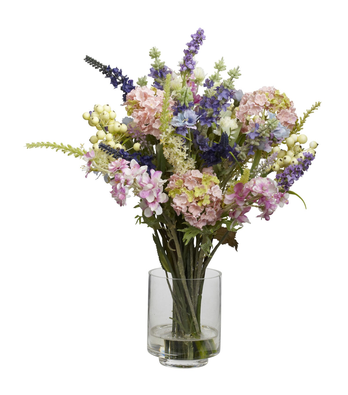 Picking the best samples from a cornucopia of choices, this Lavender and Hydrangea Arrangement is a delight of pastel and cream colors. Reaching 16 inches high and then spreading outward, this bountiful collection of flowers is the perfect addition to any home or office. Comes with a clear vase with liquid illusion, and they look so real, you’ll have people asking to see your garden.Silk floral arrangements are manufactured using synthetic materials and are well designed and constructed to be life-like in appearance.