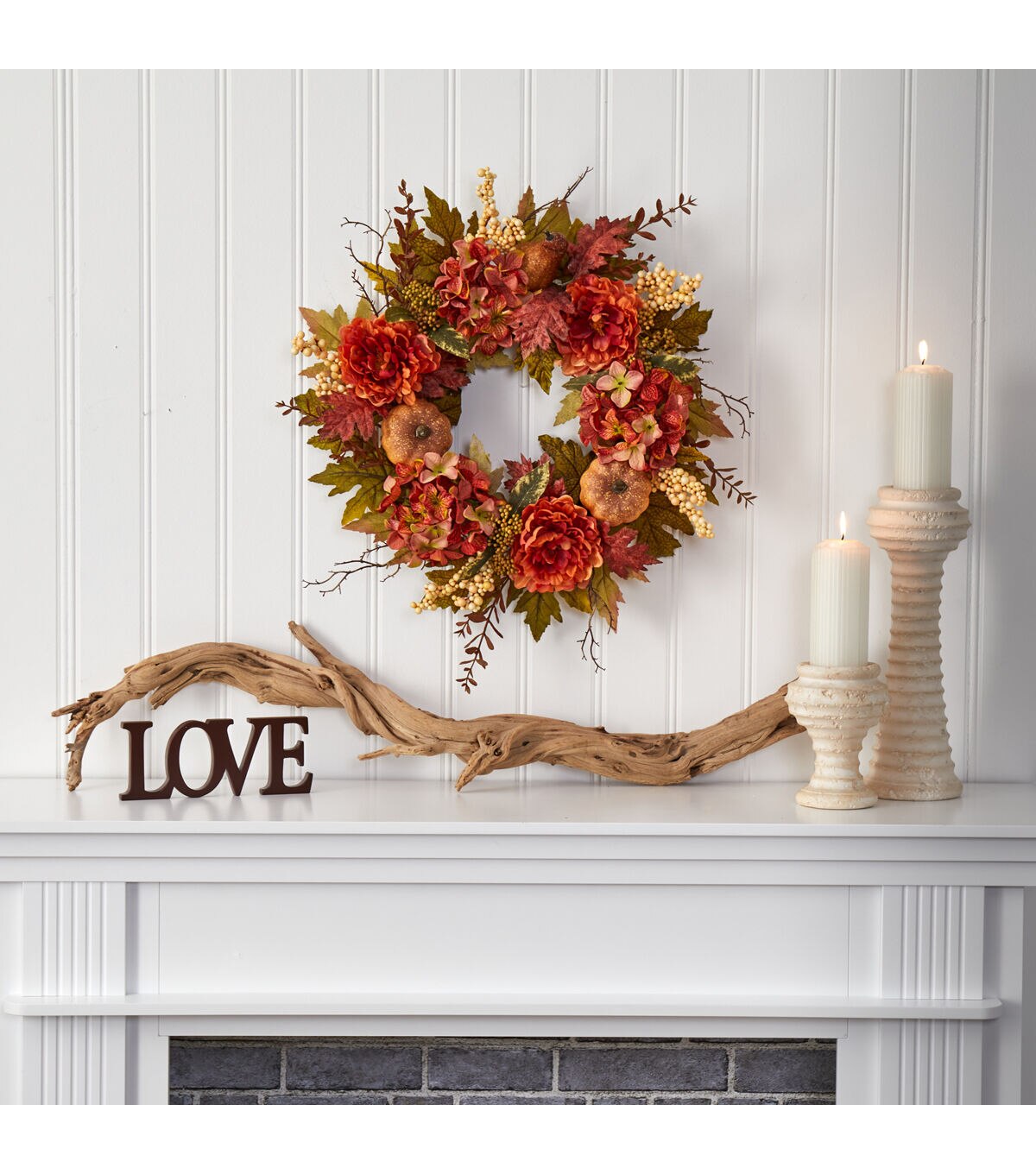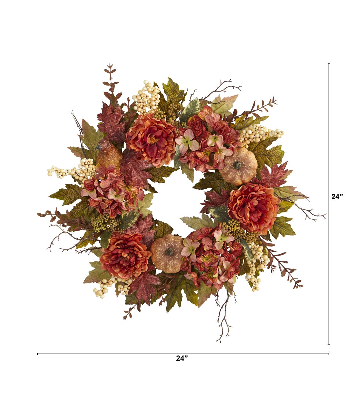 Showcase hues of the harvest with the autumn-inspired beauty provided by this colorful artificial wreath designed in fiery colors boasting seasonal favorites; a mix of dusty evergreens, handsomely complemented with silk hydrangeas and peonies, accented throughout with sprays of faux berries and decorative pumpkins - all of which look incredibly lifelike. Perfect for sprucing up a bare wall or an empty doorway, this 24” (in circumference) artificial wreath would undoubtedly make for an eye-catching accent wherever displayed. Silk plants are manufactured using synthetic materials, such as polyester material or plastic, and are well designed and constructed to be life-like in appearance. This item will need to be re-shaped when removed from the secure box to allow it to reach its fullest size. Your artificial plant will look beautiful for years to come; simply wipe clean with a soft dry cloth when needed. About Nearly Natural Inc. - For over 75 years, Nearly Natural Inc. has been providing conscientious consumers with beautiful alternatives to natural decorations. Employing and advised by naturalists who understand the live plant world, Nearly Natural is able to recreate the most realistic-looking decorative items for homes, offices, and businesses. Driven by a true commitment to customer service, attention to detail, and natural philosophy, Nearly Natural strives to bring customers the most beautiful, unique, and striking faux plants and floral on the market.