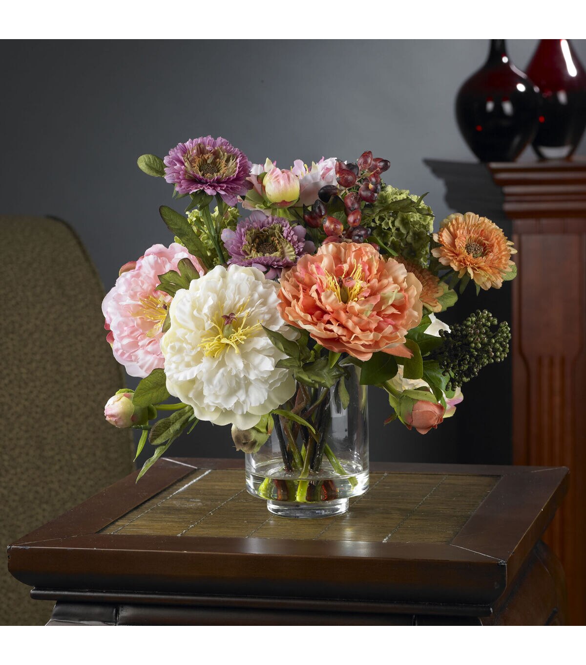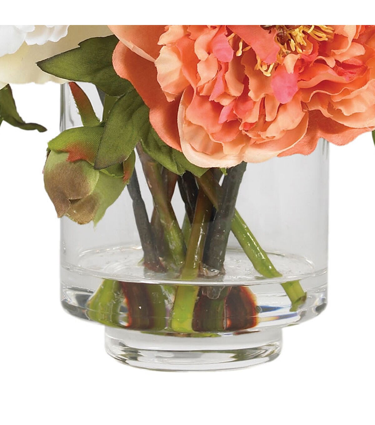 Nothing says “wow” quite like this striking mixed peony arrangement. Featuring several distinct blooms in varying stages of maturity, the mixture of textures and colors that this arrangement offers is both eclectic and bold. Standing 10” high, this arrangement comes in a glass vase with liquid illusion, which completes its elegance quite nicely.Silk floral arrangements are manufactured using synthetic materials and are well designed and constructed to be life-like in appearance.