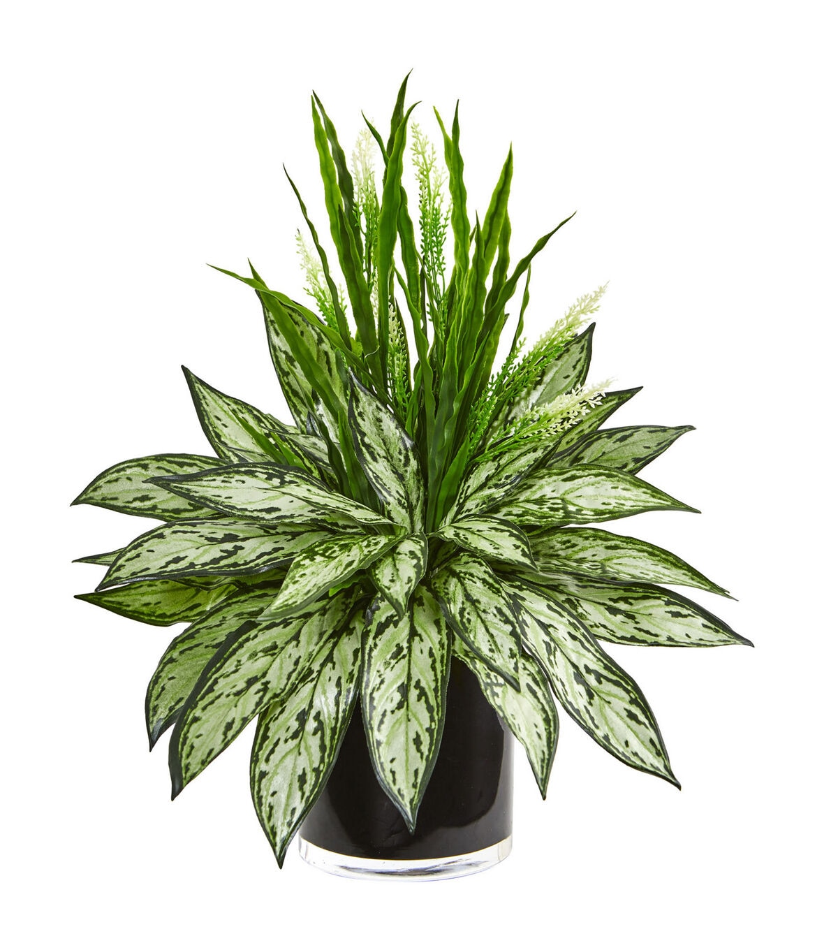 This eye-pleasing silver queen and grass artificial plant features artfully arranged variegated green leaves that gently splay outwards to reveal small, delicate blooms and long, thin green leaves. With a clean and simplistic appearance, this 20-inch ornament will bring sophistication to your interior space, especially when placed on a dining room table with a lace doily underneath. A minimal black vase comes included.