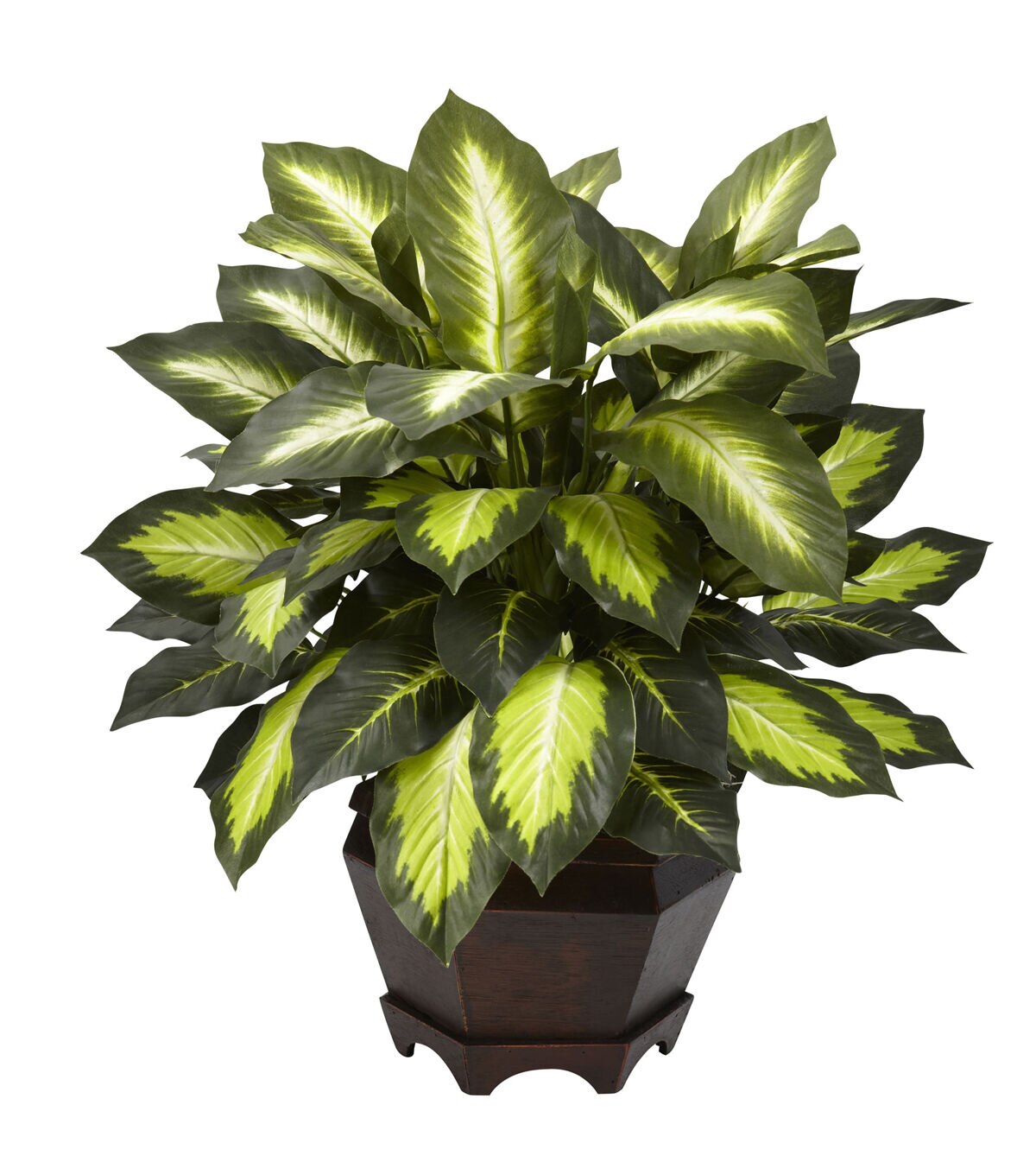 This wondrous Golden Leaf Dieffenbachia is sure to bring warmth and cheeriness to any room it graces. Standing slightly over 20 inches high, it’s compact enough to fit on your desk or any small space that needs some sprucing up. Crisp brightly colored leaf centers surrounded by a deep green outline add a nice distinguishing touch. Nestled in a warm traditional wooden vase, this authentic looking Dieffenbachia silk plant will bring you years of maintenance free pleasure. Silk plants are manufactured using synthetic materials, such as polyester material or plastic, and are well designed and constructed to be life-like in appearance. This item will need to be re-shaped when removed from the secure box to allow it to reach its fullest size. Your plant will look beautiful for years to come; simply wipe clean with a soft dry cloth when needed.