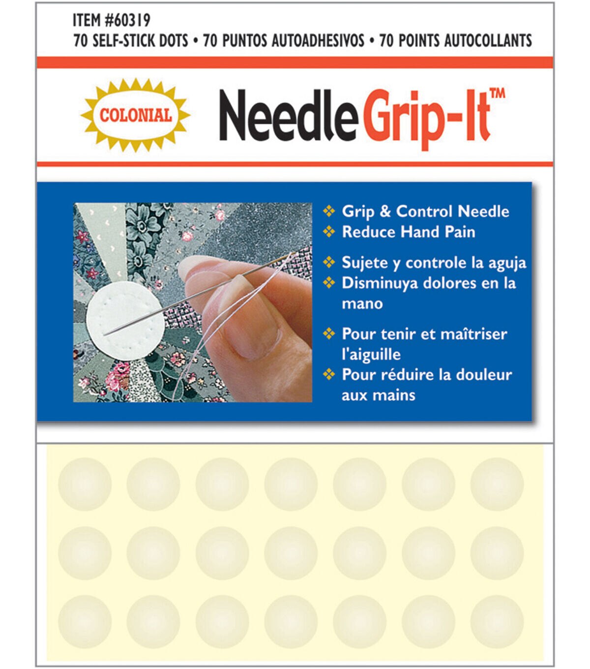 The Colonial Needle Grip-it Flexible Self-adhesive Dots will give your fingers a little more traction when hand sewing quilting, cross-stitching and more. These self-adhesive dots are soft and flexible. All you need to do is stick these dots onto your thumb and the fingers you use to pull or push needles. This pack contains 70 dots.