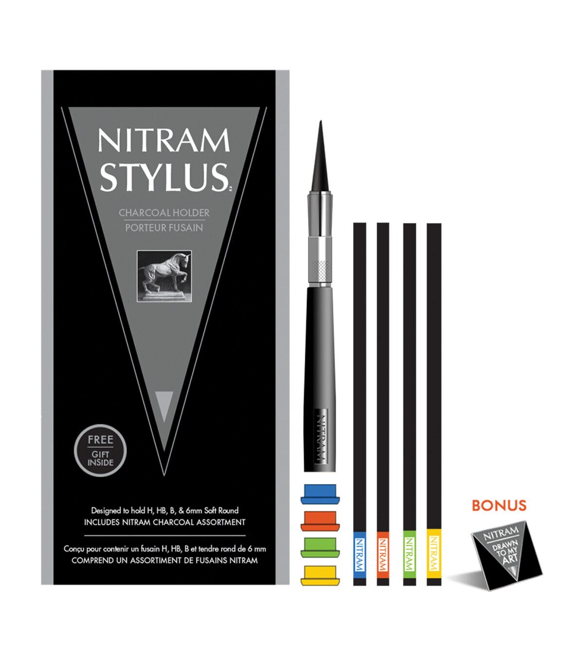 A charcoal stylus allows for precise control and prolonged use of charcoal sticks even when they are small and stubby. The Nitram Stylus is designed to hold Nitram H, HB, B and 6mm soft round charcoal sticks. This set contains one Nitram Stylus, one each of Nitram charcoal H, HB, B and 6mm soft round charcoal sticks and a set of four color-coded end caps.