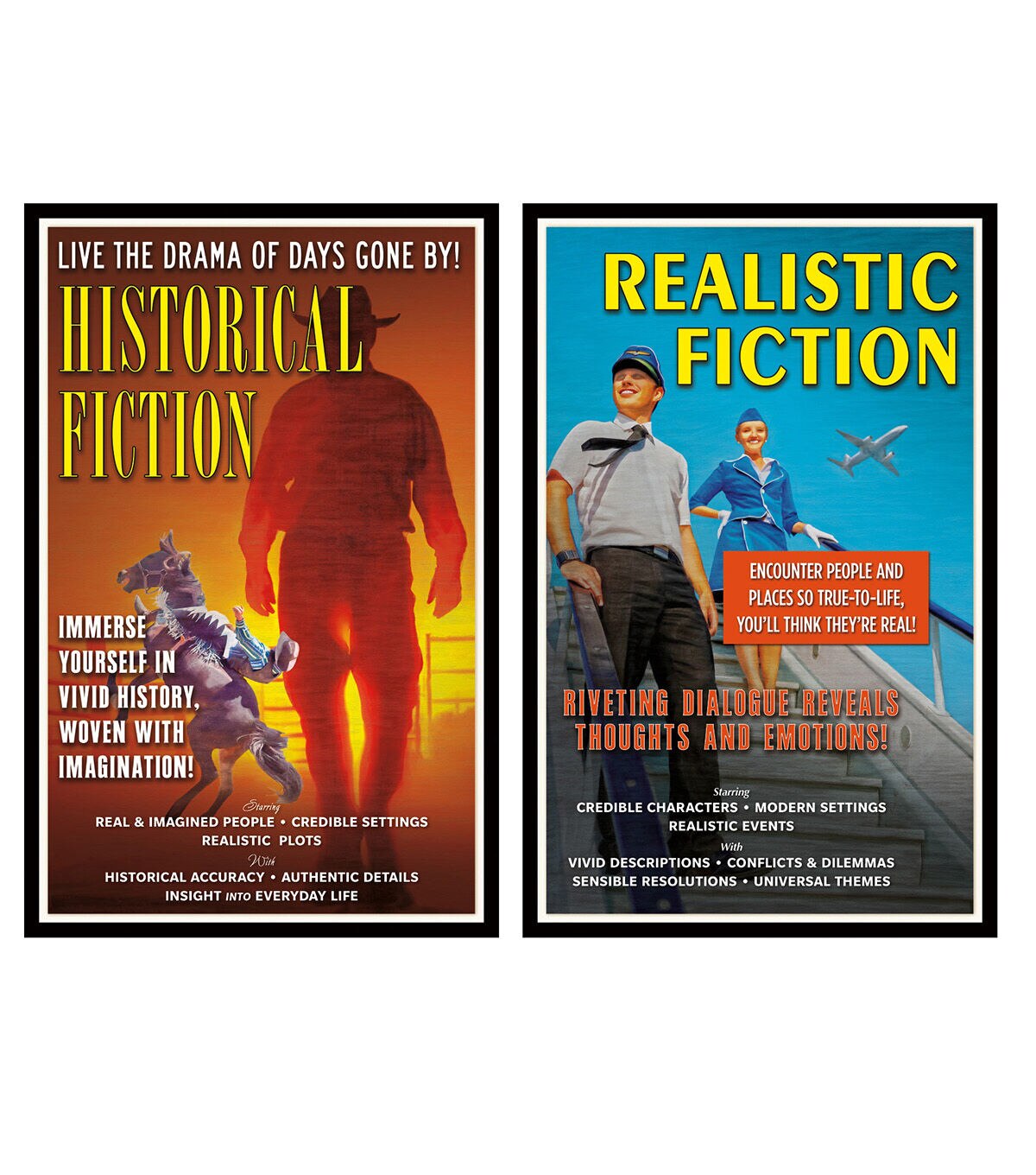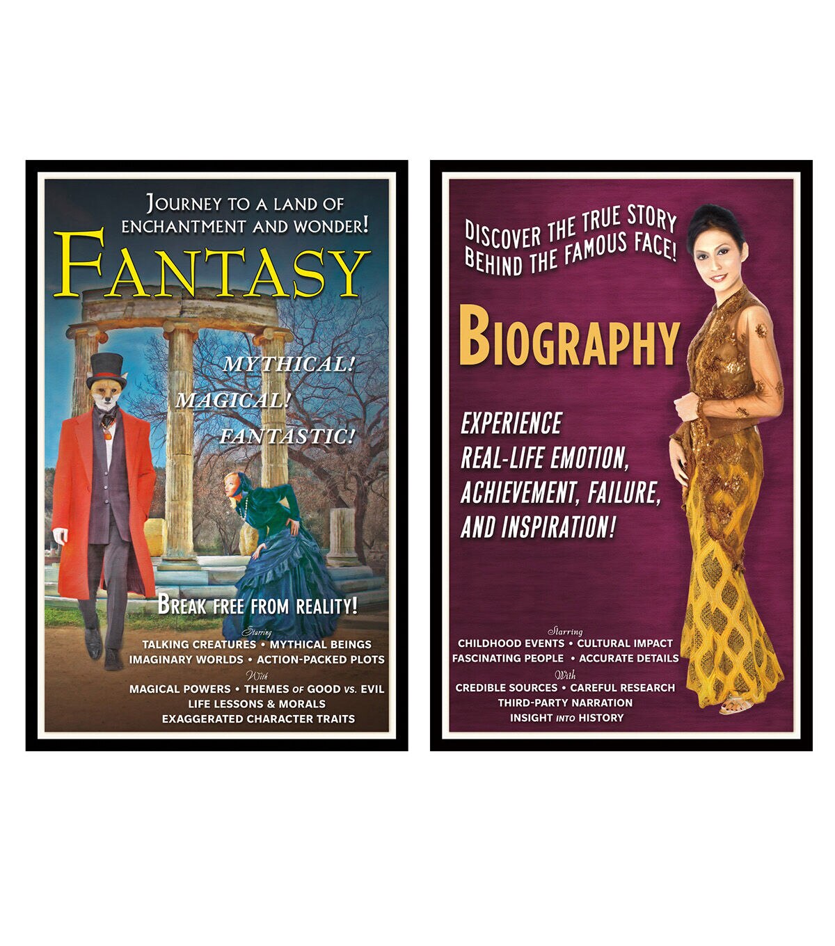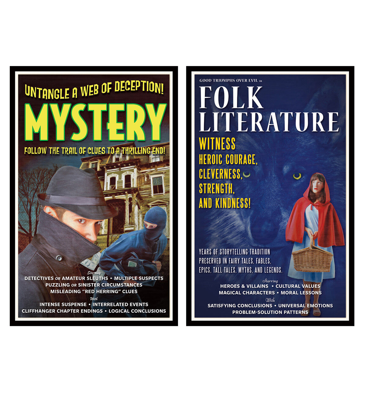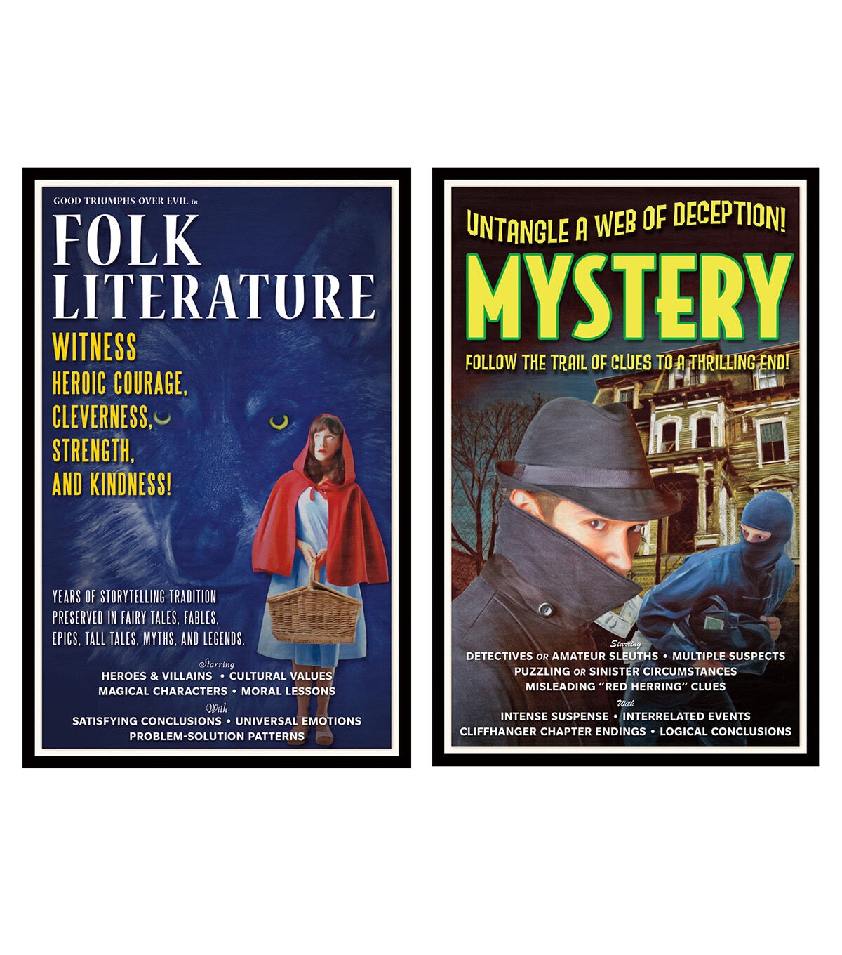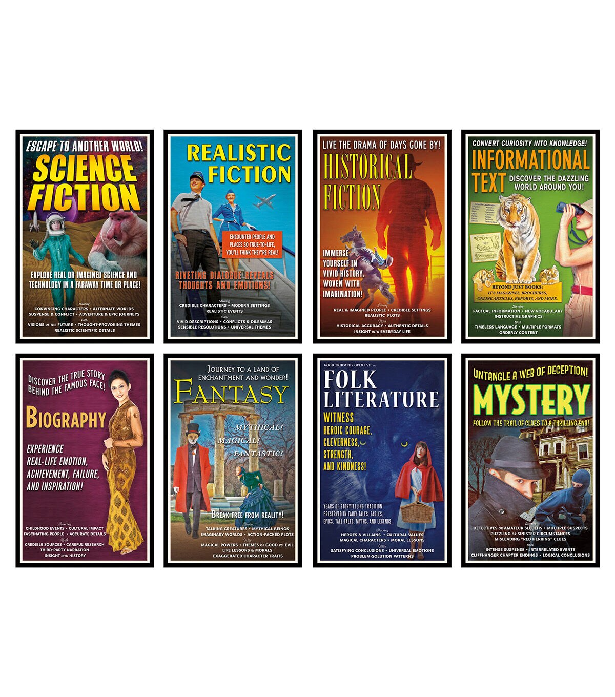 Shine a spotlight on literary genres with this innovative approach to teaching fundamental subject matter. Styled after vintage movie posters, this bulletin board set acquaints students with eight major genres of literature, highlighting common themes, character traits, settings, story structures, and literary devices. From the intense suspense and puzzling events of a mystery to the well-researched, chronological details of a biography, each poster offers a snapshot of the featured genre's major elements. Each set includes 8 colorful 11" x 17" (27.9 x 43.2 cm) posters and a two-page teacher guide. Sold as a pack of 2 complete bulletin board sets.