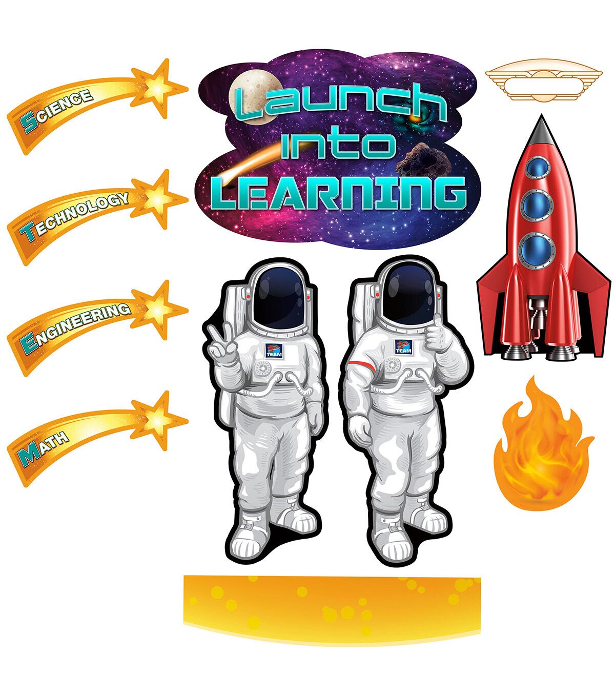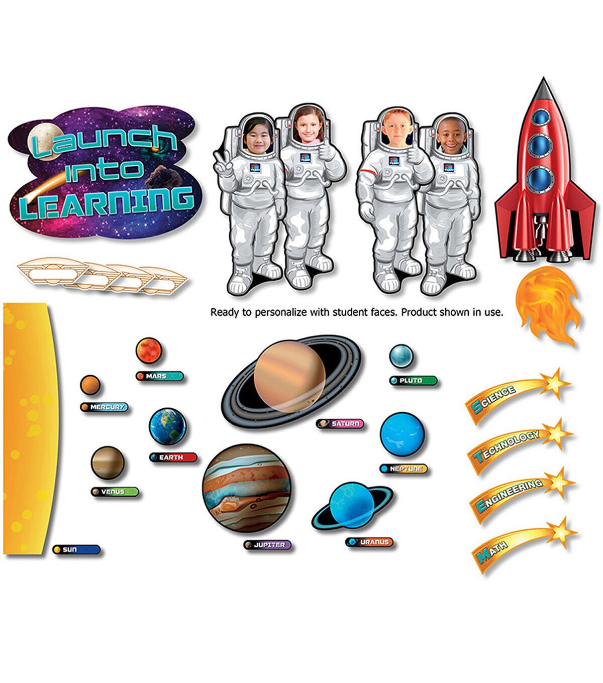 Explore new galaxies with this versatile, welcome-to-the-classroom set featuring planets, astronauts, and other space-themed artwork. Die-cut astronauts (16" high) are designed for personalization with students' photos, and commander badges to assign rotating classroom tasks are sure to capture students' imagination. Other pieces include planets with labels to teach about the solar system, and comets featuring the S.T.E.M. acronym—a natural extension of astronomy and space exploration. 35 pieces.