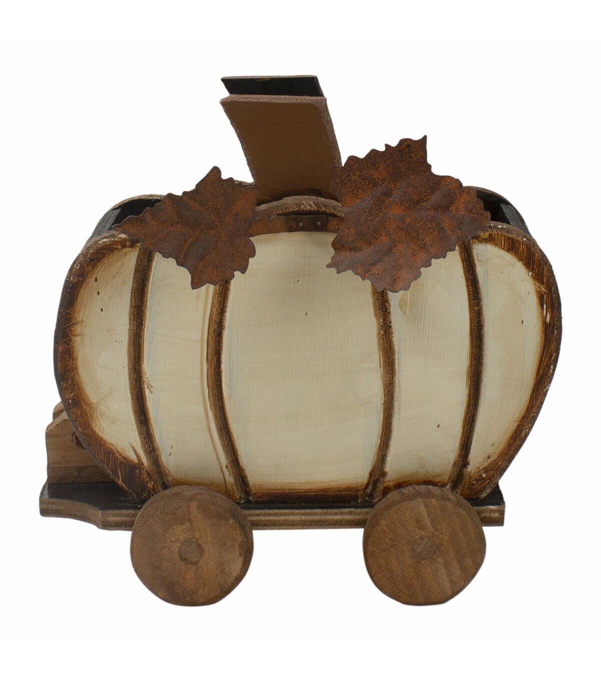 This adorable cart would be the perfect addition to your fall decor. This cart is made from carved wood to look like a pumpkin with rustic metal vine details. Place on any tabletop in your home or use it as a centerpiece.