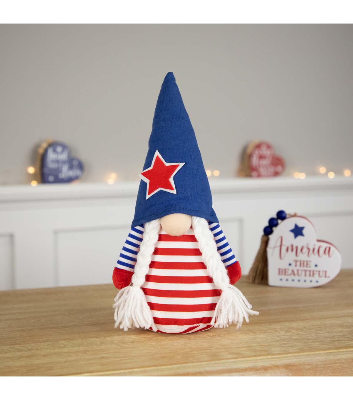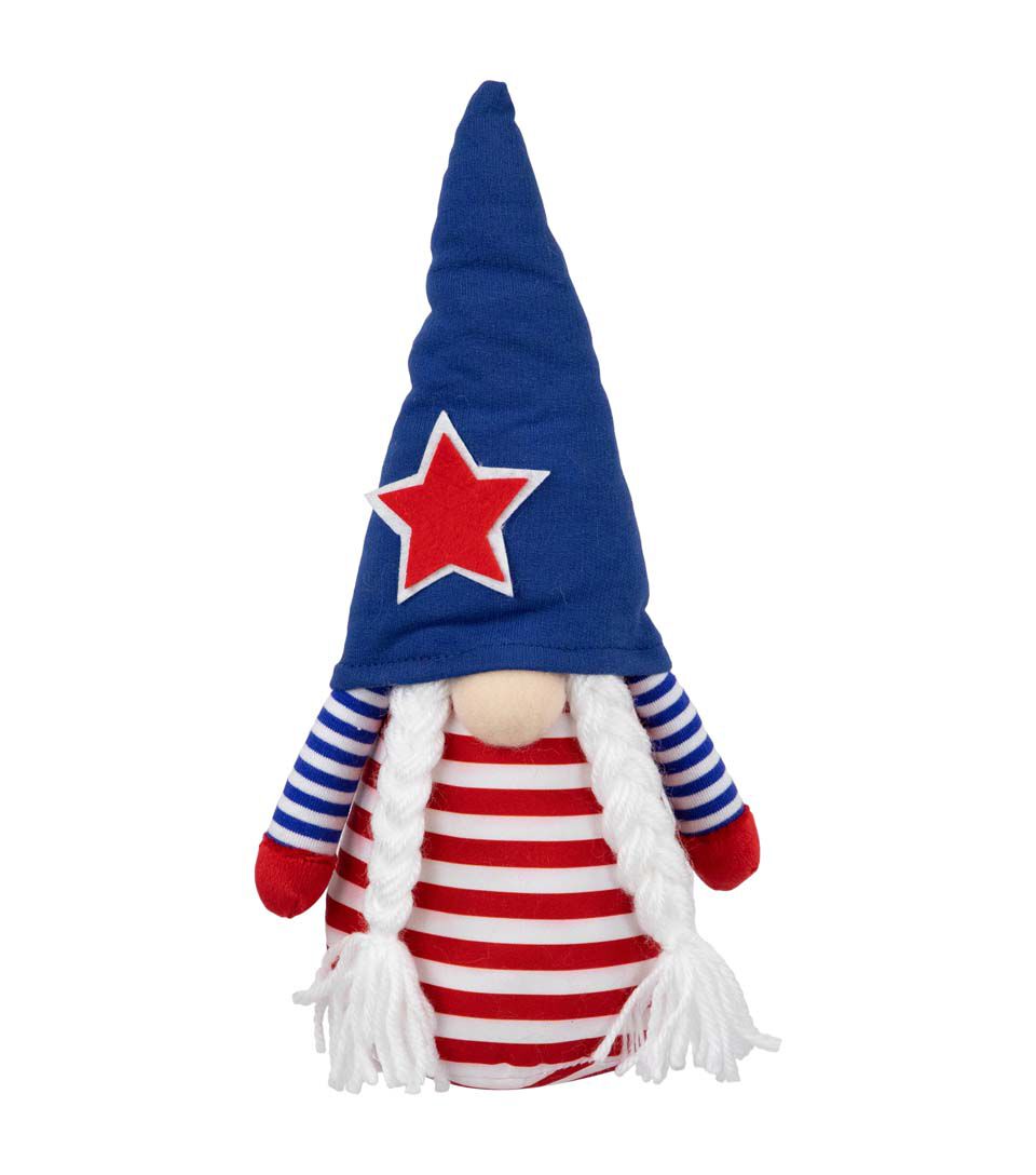Meet the Americana patriotic gnome girl figure - a delightful and enchanting addition to your patriotic décor! This charming gnome exudes the spirit of Americana with her eye-catching outfit adorned in striking red blue and white stripes capturing the essence of the stars and stripes. Sporting a blue pointy gnome hat accentuated with a star she adds a touch of whimsy and pride to any space. Whether it's the 4th of July Memorial Day or simply celebrating the love for the USA this spirited Americana Girl Gnome is sure to evoke smiles and foster a sense of national pride wherever she finds her home!