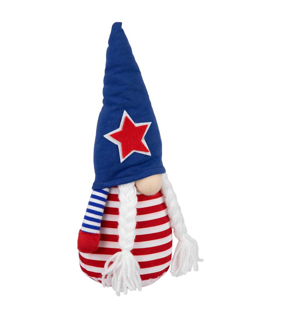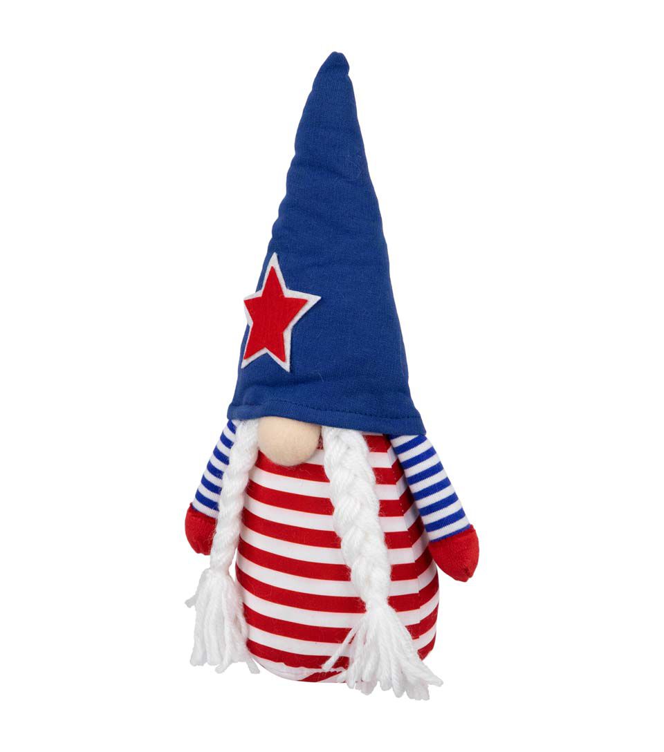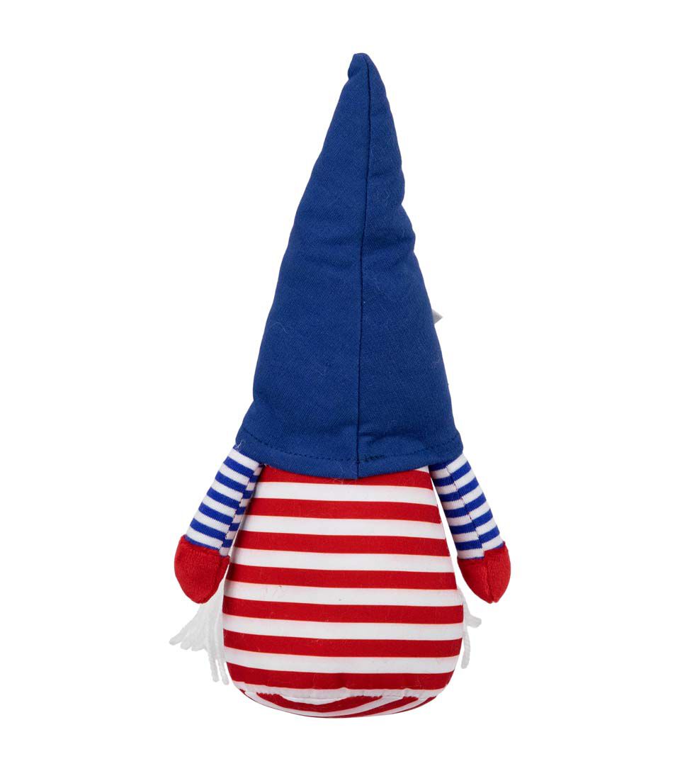 This adorable gnome is dressed in a striped red white and blue outfit with a blue hat accented with a star