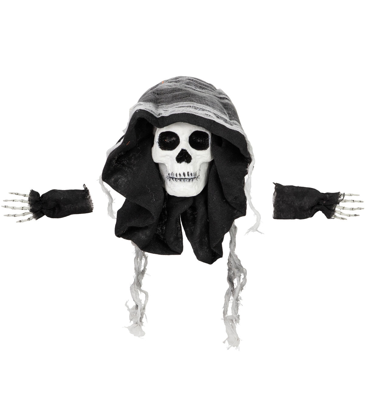 Skeletons ghosts and ghouls Oh My! Add this creepy skeleton to your decor for a one of a kind statement piece. The hooded skull and skeleton hands lend a 3-D effect as if it's coming through the window. Suction cups hold it securely to any smooth flat surface.