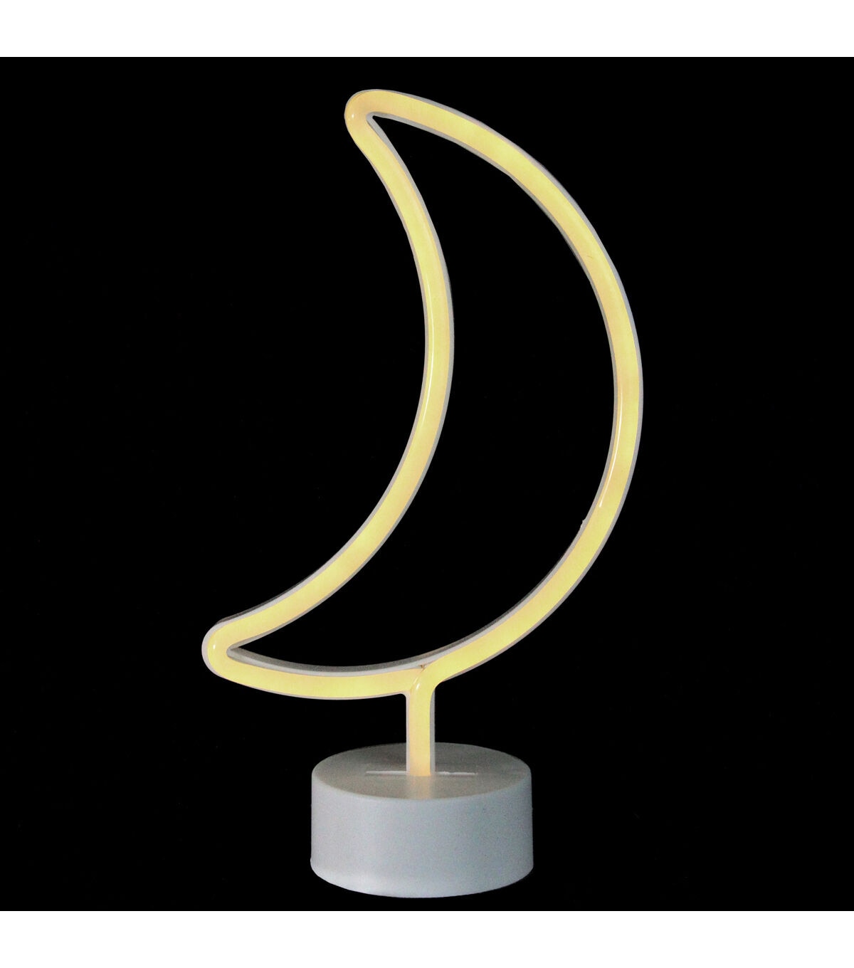 Always shoot for the moon! Light up your desk mantle or table with this fun modern crescent moon neon sign. Perfect as a night light for the little lunar lover in your life! Product Features: Color: warm white bulbs One-sided design LED lights use up to 80% less energy Super bright vibrant bulbs Bulbs stay cool to the touch Requires (3) AA batteries; not included Comes with detachable base for easy storage Convenient on/off switch at the bottom Recommended for indoor use only Dimensions: 11.5"H x 6.75"W x 3.25"D Material(s): plastic/silicone