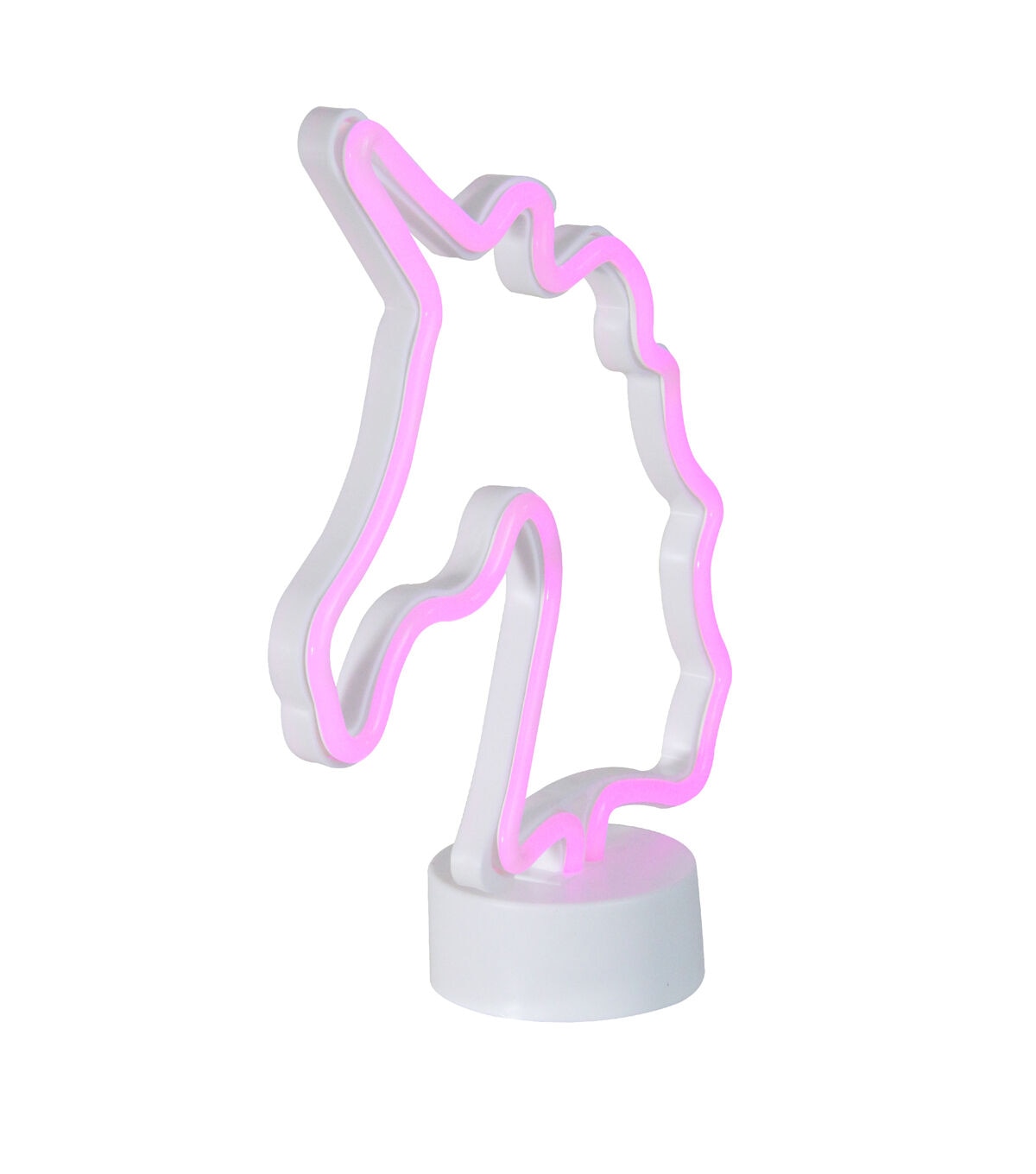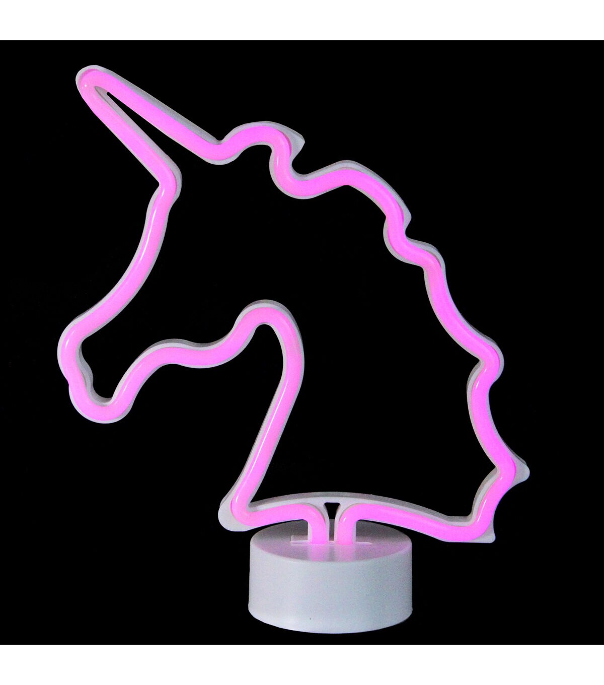 Believed to have magical healing powers unicorns have become a major trend in today's pop culture. Light up your desk or table with this fun modern neon unicorn sign. Perfect as a night light or birthday party center piece. It works with 3 AA size batteries (not included). Product Features: Color: white bulbs One-sided design LED lights use up to 80% less energy Super bright vibrant bulbs Bulbs stay cool to the touch For indoor use only Requires (3) "AA" size batteries - not included Comes with detachable base for easy storage Convenient on/off switch at the bottom Dimensions: 11"H x 9.75"W x 3.25"D Material(s): plastic/silicone