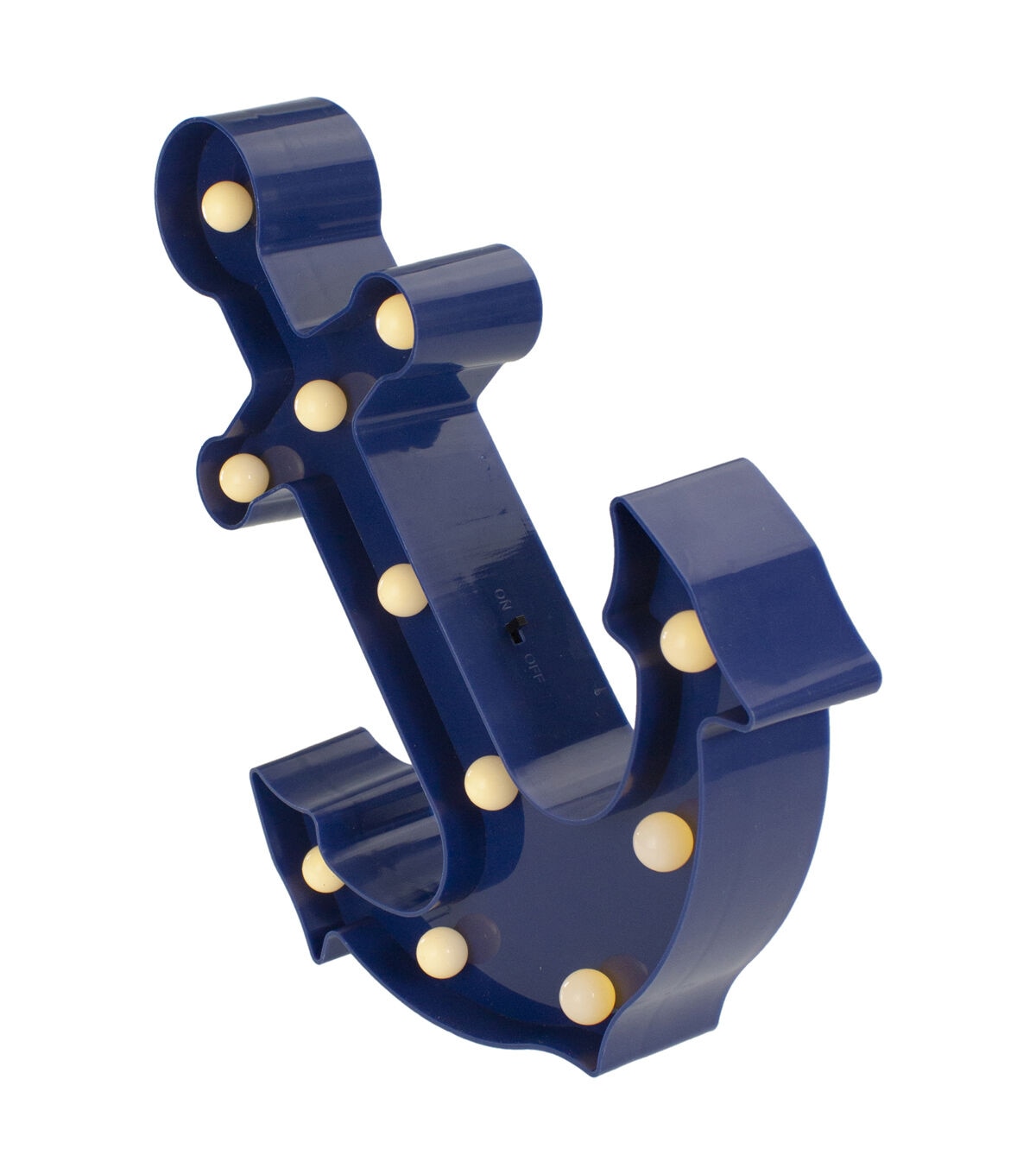 Light up your desk mantle or wall with this fun nautical anchor marquee sign. The sign is lined with warm white LED lights that give off a soft glow. Perfect as a night light for the little nautical lover in your life! Product Features: Illuminated by LED lights Color: warm white bulbs One-sided design LED lights use up to 80% less energy Bulbs stay cool to the touch Requires 2 "AA" size batteries (not included) Convenient on/off switch on the side Comes ready-to-hang with a keyhole hook on the back Recommended for indoor decorative use only Dimensions: 12.5"H x 9.5"W x 2"D Material(s): plastic