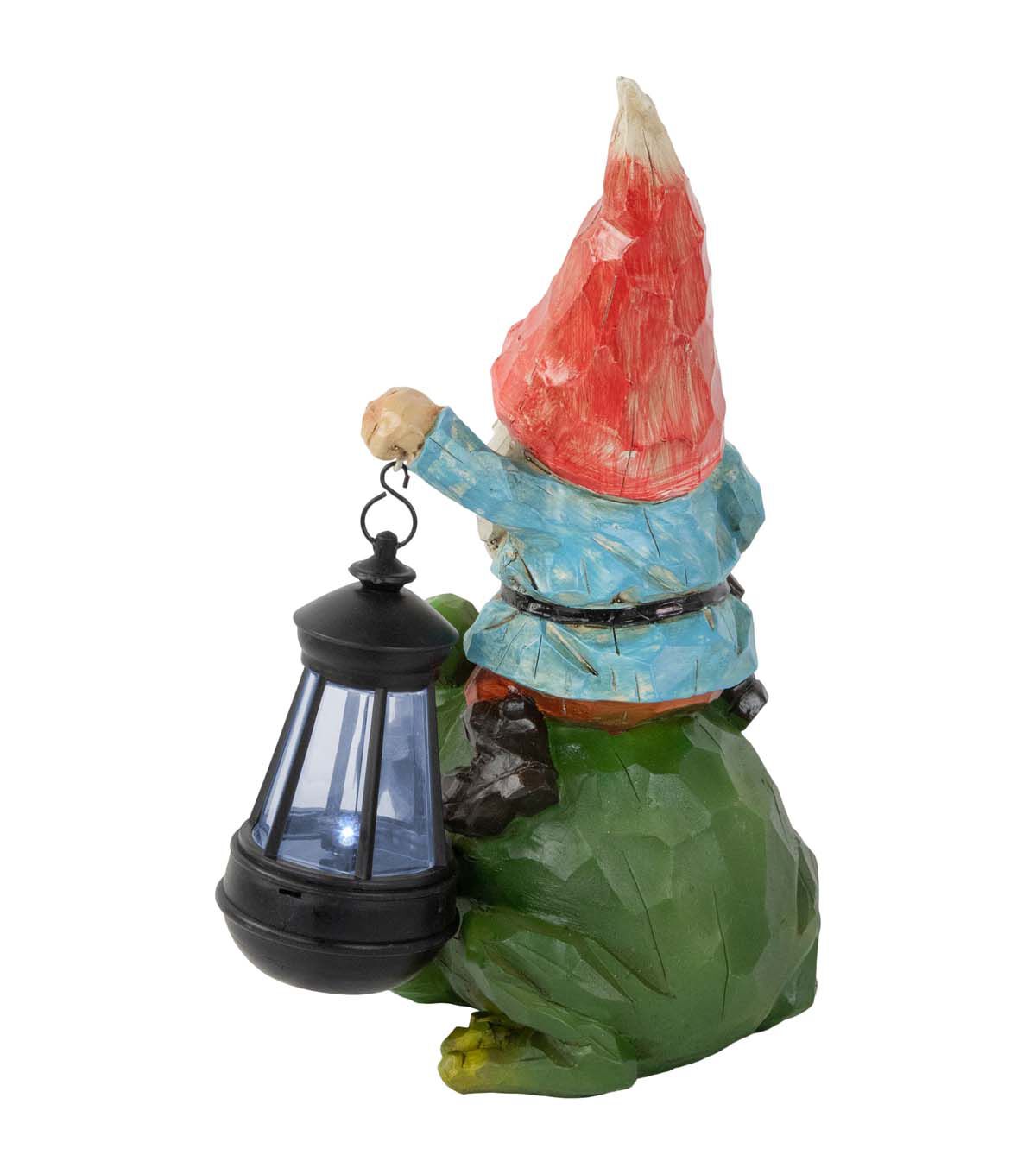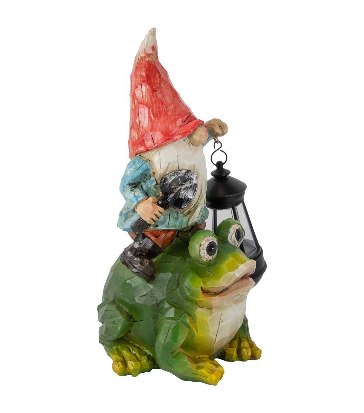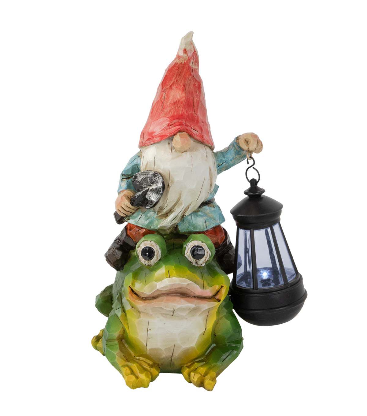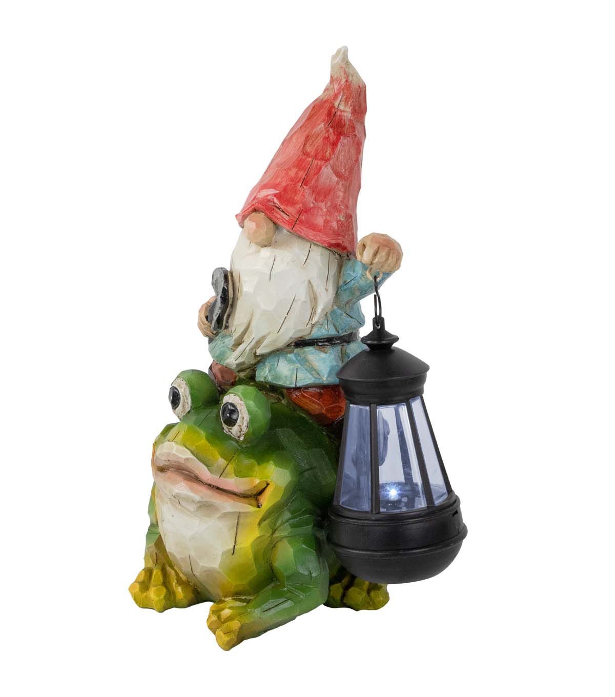 Enhance the beauty of your outdoor decor with this LED-lighted solar-powered garden statue. It features a cute gnome with a lantern standing on top of a frog. This will make a great addition to your backyard front yard garden or porch.