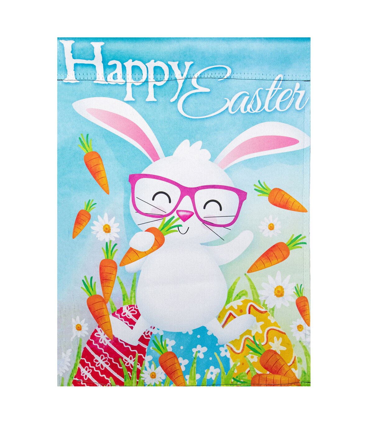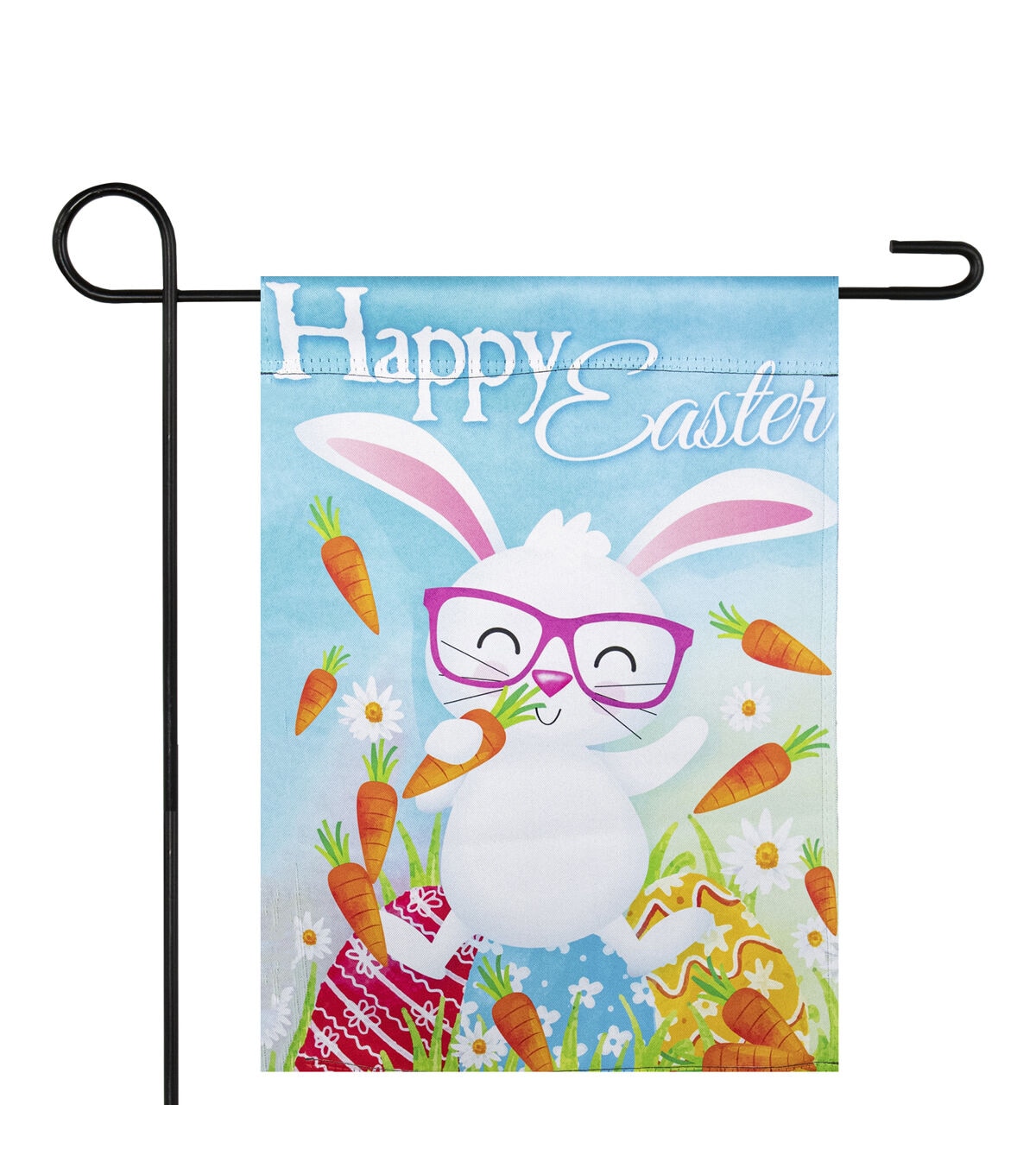 Capture the beauty of this Easter season with this garden flag. A combination of flowers Easter eggs and a super fun bunny the bright design is sure to inspire envy from all who see it! Perfect for adding color and beauty to your spring outdoor decor. Features: Reads “Happy Easter" in white script. Bright design with a smiling bunny and lots of carrots. A soft high-quality fabric for durability. Sleeve on top allows the flag to slide onto the flagpole. Double-sided design. Care instructions: Handwash in cold water with mild soap. Hang dry. Use cool iron if needed Dimensions: 18" long x 12.5" wide. Material(s): polyester. Note: Flagpole is not included