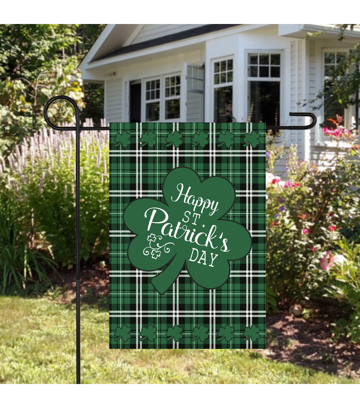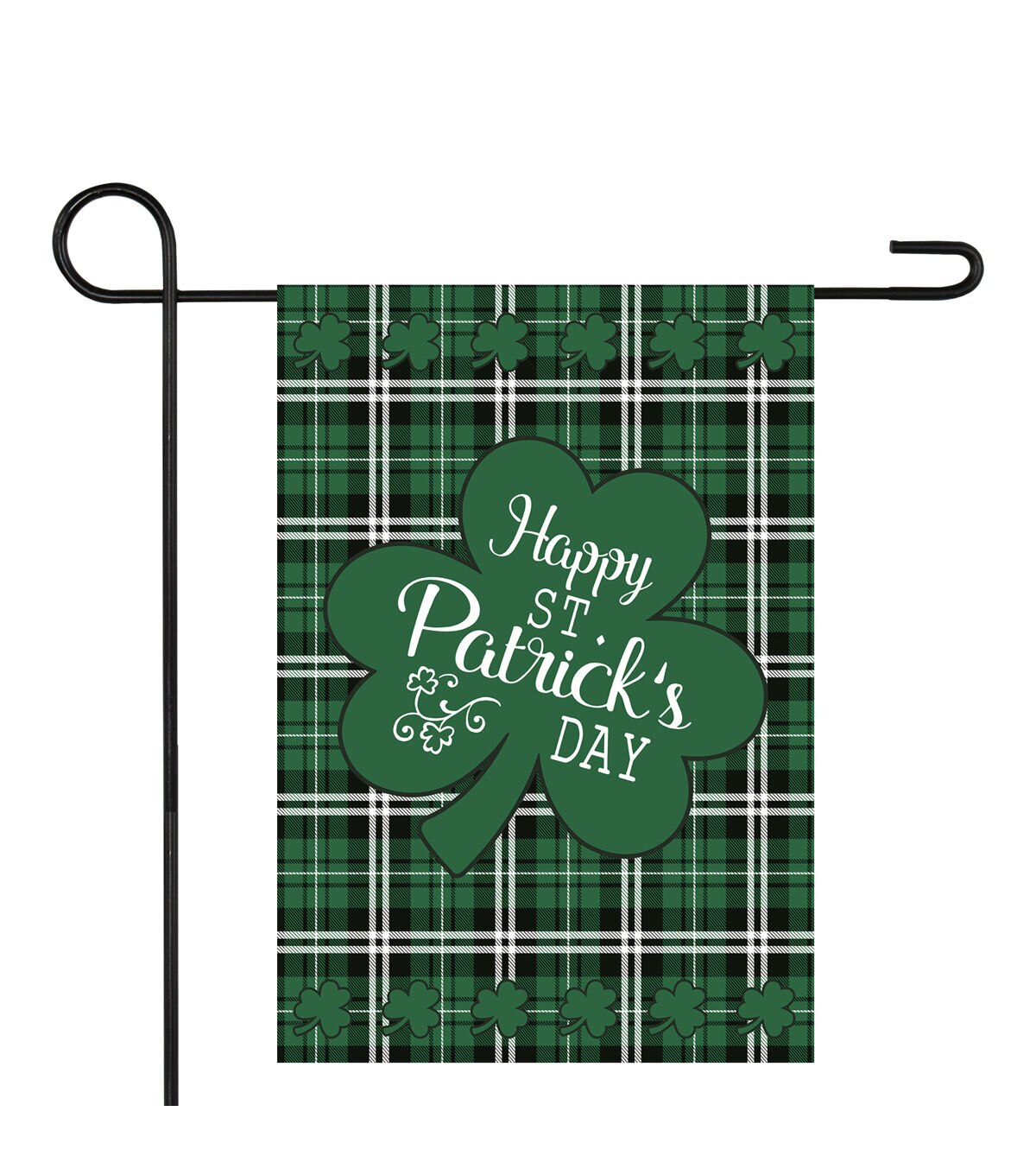 Represent your Irish heritage with this plaid shamrock garden flag. Bring a pinch of luck and a pop of color to your home by displaying this flag in your yard. Just perfect for St. Patrick's Day. Features: Green white and black plaid designed garden flag. Reads "Happy St. Patrick's Day". Designed with a large shamrock and a border of mini shamrocks. A soft high-quality fabric for durability. Sleeve on top allows the flag to slide onto the flagpole. Double-sided design. Care instructions: Handwash in cold water with mild soap. Hang dry. Use cool iron if needed Dimensions: 18" long x 12.5" wide. Material(s): polyester. Note: Flagpole is not included