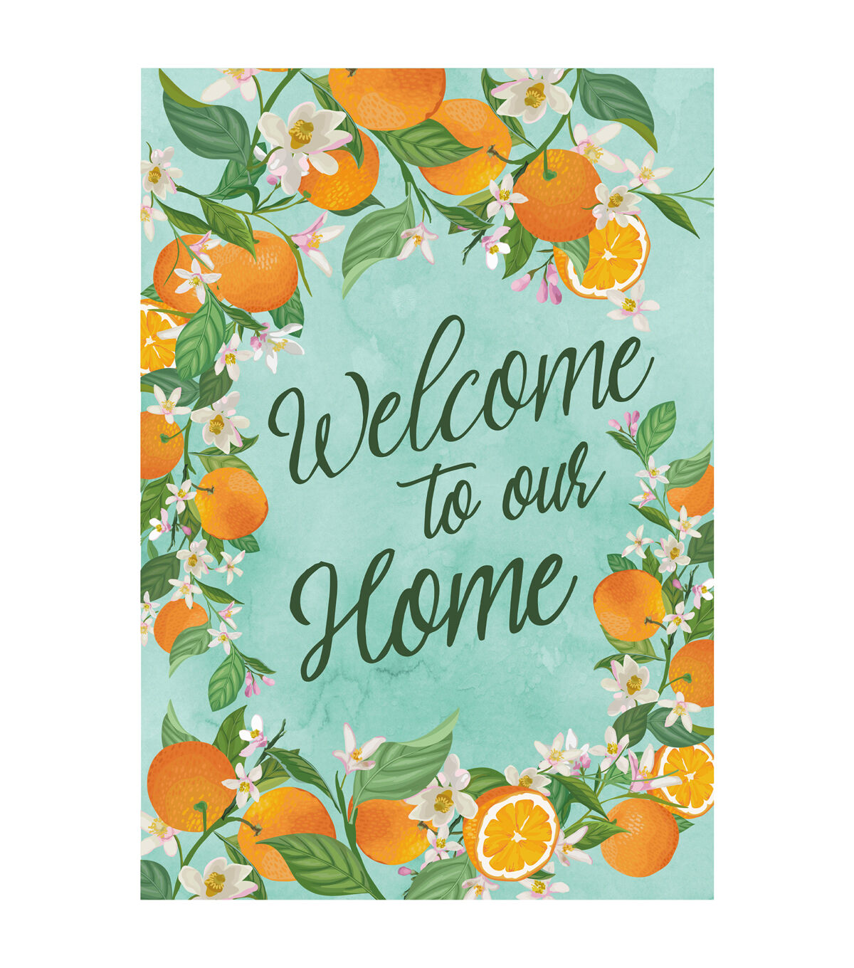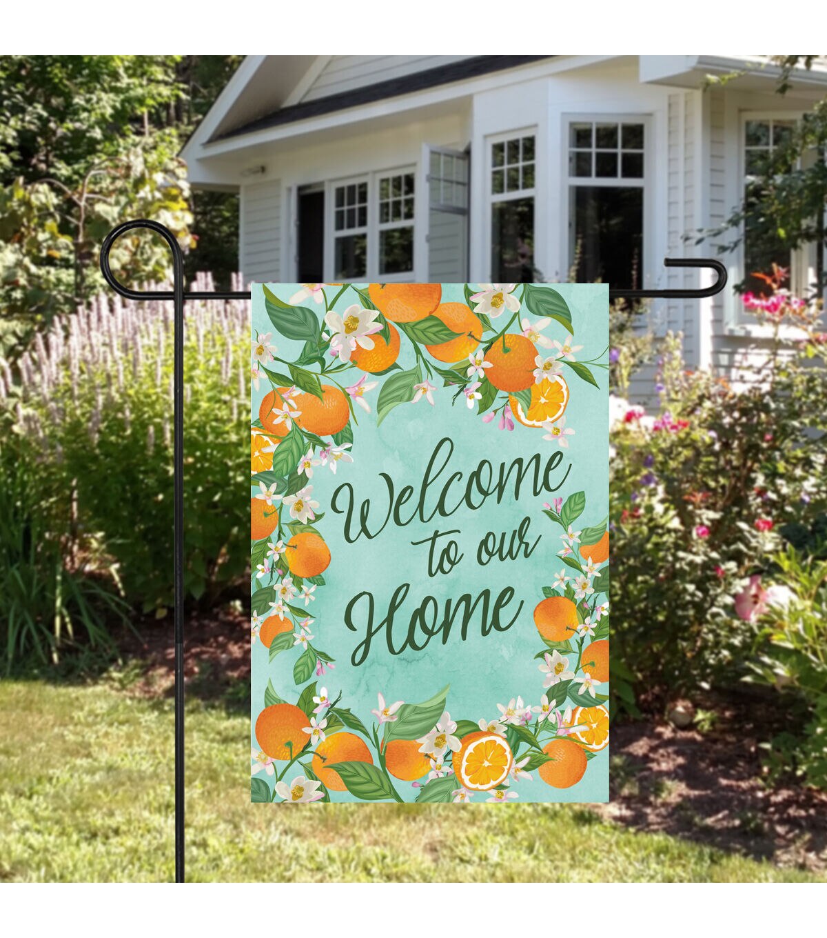 This garden flag will cheerfully welcome loved ones to your home. The perfect addition to your spring and summer decor. Designed with a wreath of oranges and white flowers it will add a sweet pop of color wherever it is displayed.