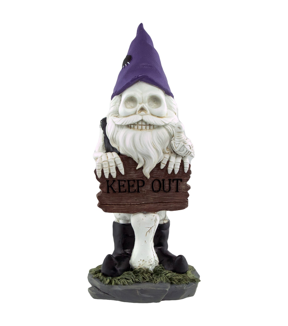 Create a frightening and ghoulish experience for your party guests with this skeleton gnome as he stands by your door to greet your guests with his "Keep Out" sign. He's wearing a black torn vest black boots and a purple hat. He is accented with a skeleton bird and a bone as the signpost. This is perfect for a tabletop display to be placed on a shelf or mantle and can be added as a fun accent to your party decor.