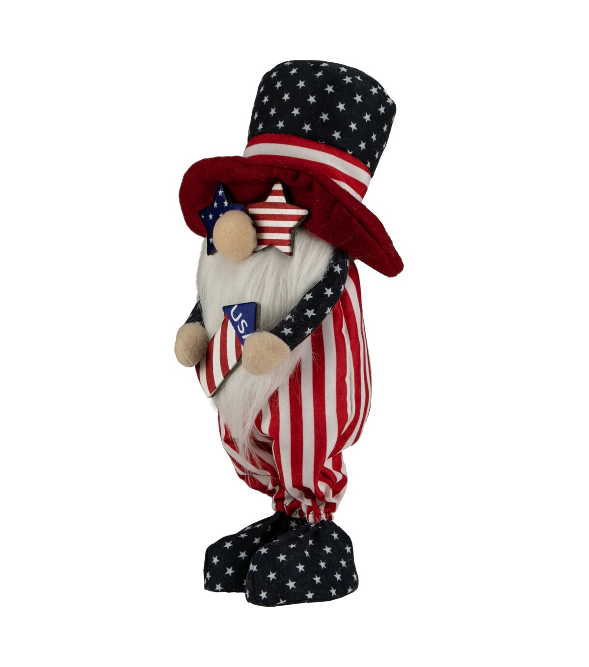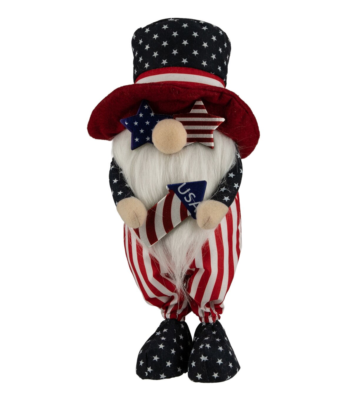 Gnomes are best known for guarding Earthly treasures providing good luck and are perfect for protecting your goodies. This gnome is wearing a flag style outfit hat and sunglasses and holds a flag rocket. His large bulbous nose pokes out from his long white beard. Place this gnome on your mantle or alone on any table for the perfect patriotic decoration.